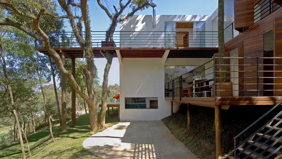 Walkway House is divided into blocks scattered across the site so as not to interfere with the Atlantic Forest and to preserve the existing topography. These blocks are interconnected by wooden decks that cross each other without touching. The upper deck emerges from the back of the plot, in direct contact with the vegetation, traverses the entire house and, as the ground level drops toward the front, it transforms into a walkway nine meters above the ground, aligning itself with the treetops.