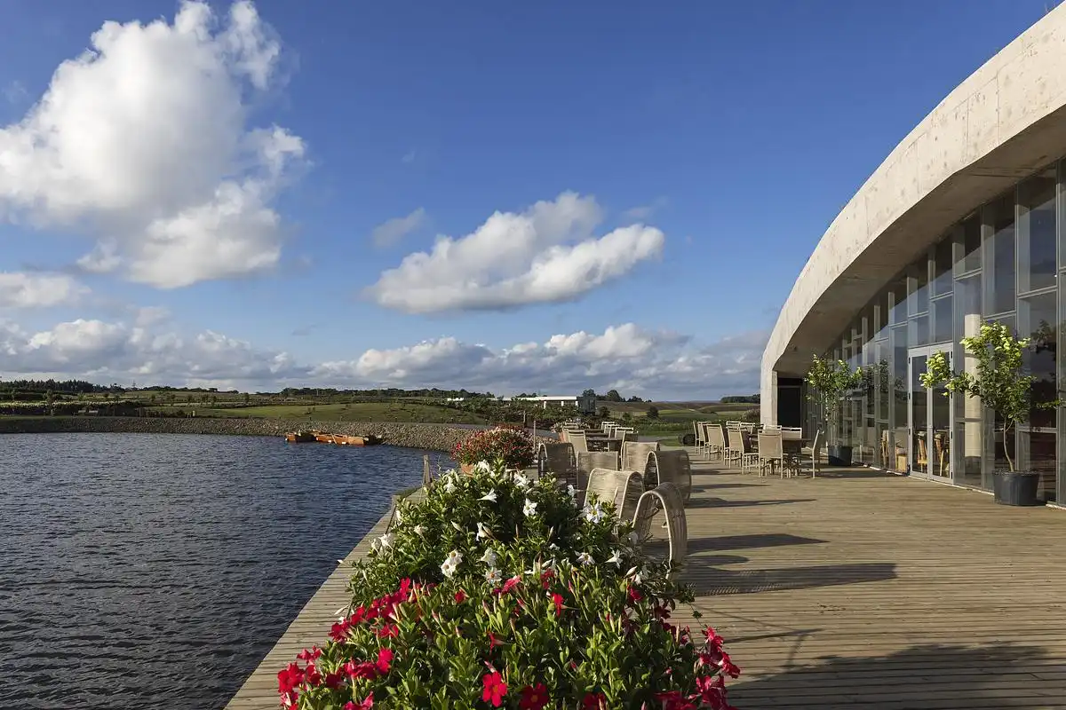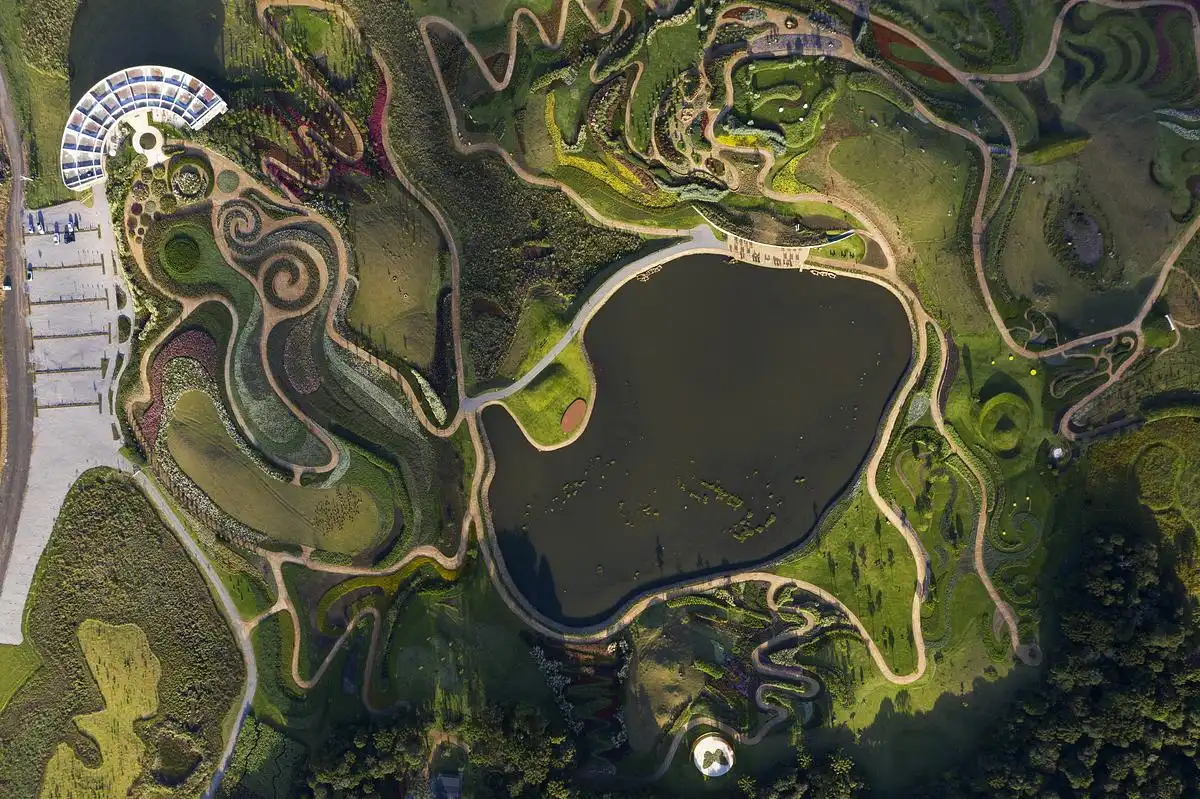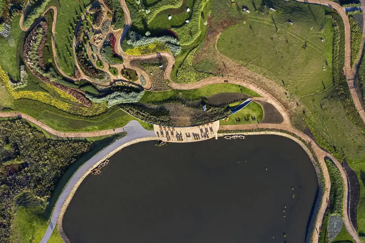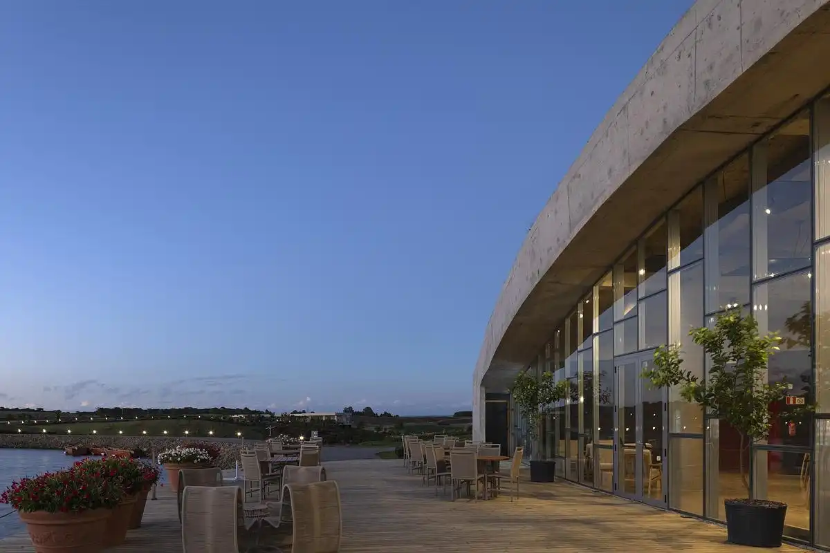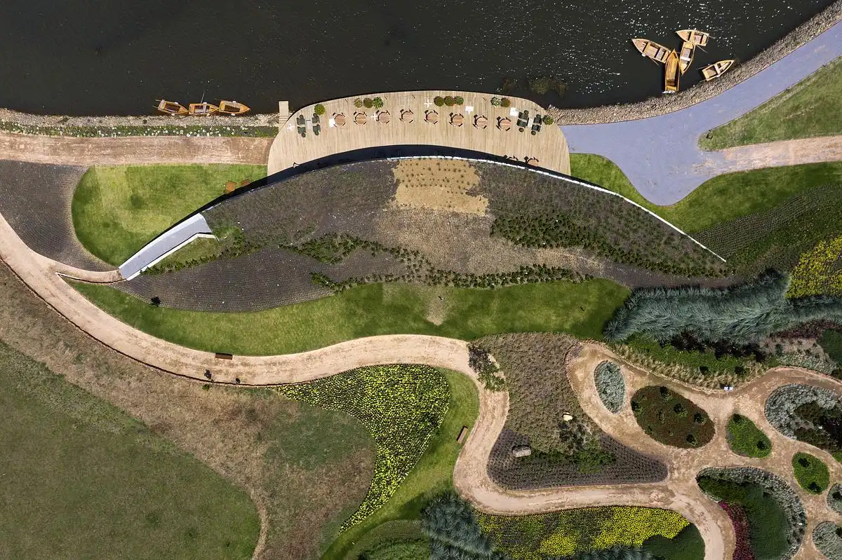 The inspiration came from the surrounding landscape of Matria Parque de Flores. Instead of creating an object placed on the land, we wanted the building to become part of the terrain. By following the natural topography, the restaurant feels integrated into the hills and gardens, giving visitors the sense that architecture and nature are one.