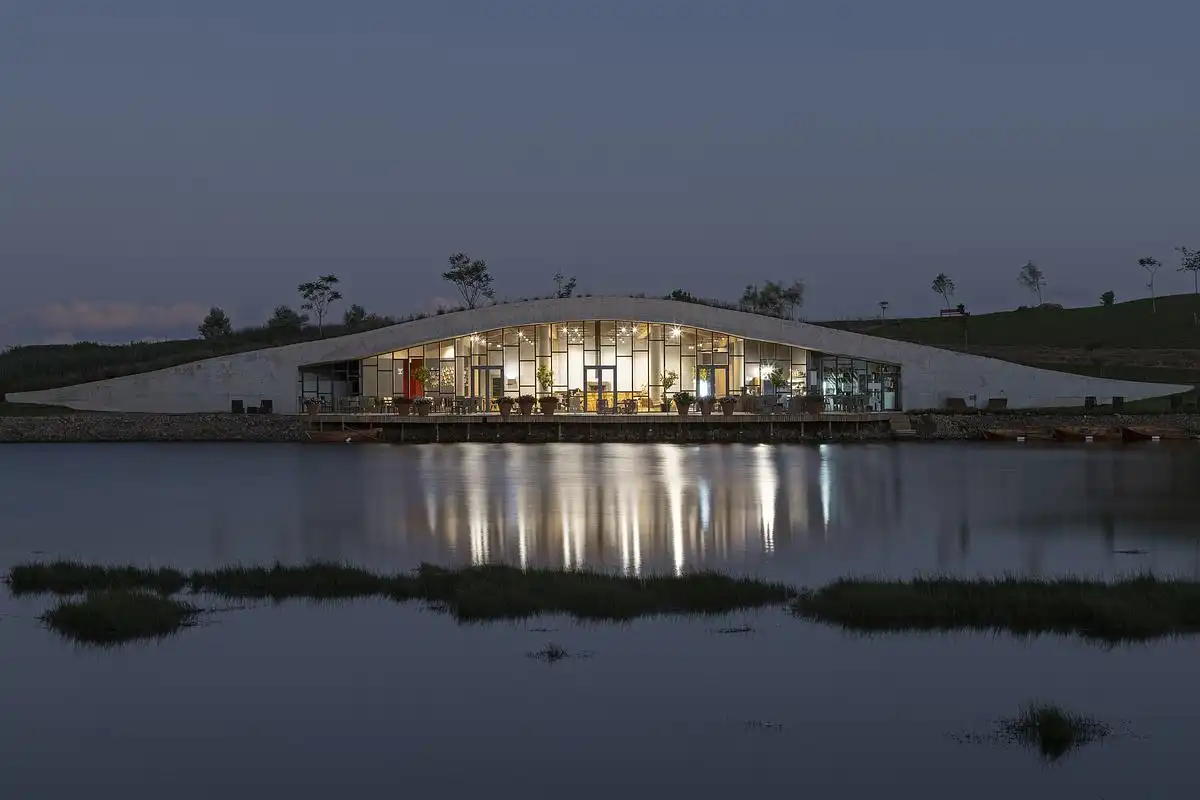 Inspired by the mountains and vegetation around the park, the restaurant was designed to follow the existing relief, partially camouflaged within the landscape. Its structure extends towards a large lake, framing views of the sunset. Exposed concrete and finely detailed frames define its contemporary character, while the use of local materials reflects a sustainable approach, reducing the need for long-distance transportation.