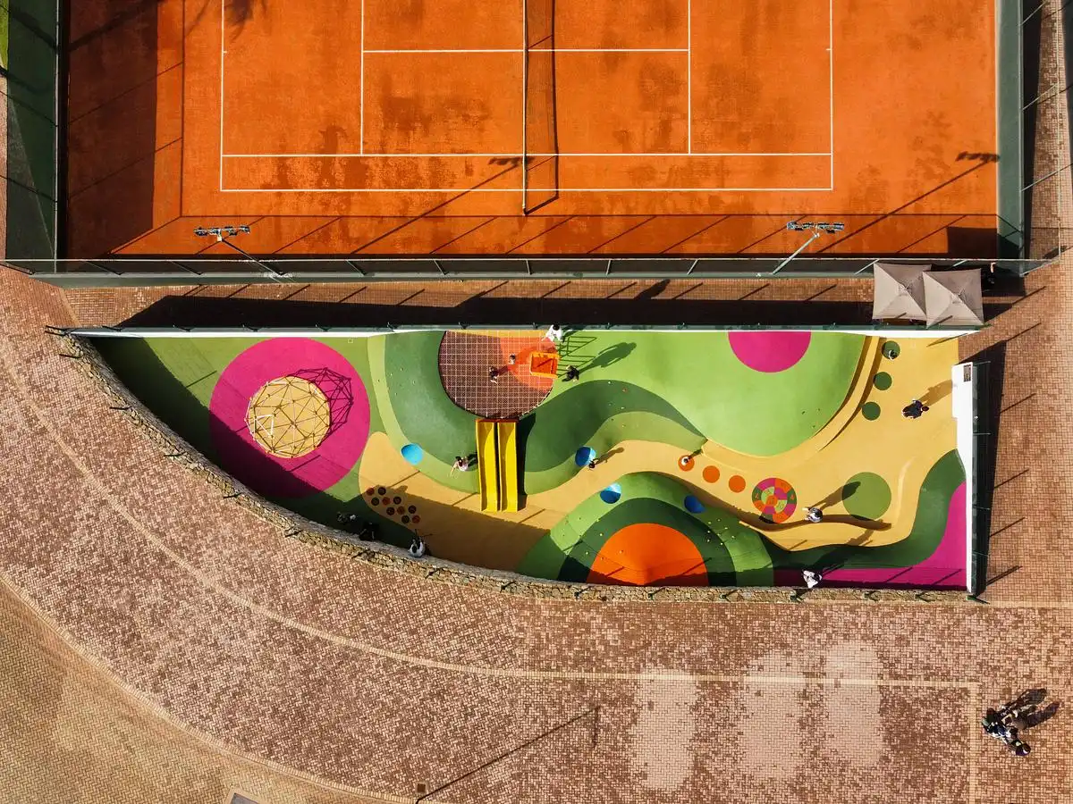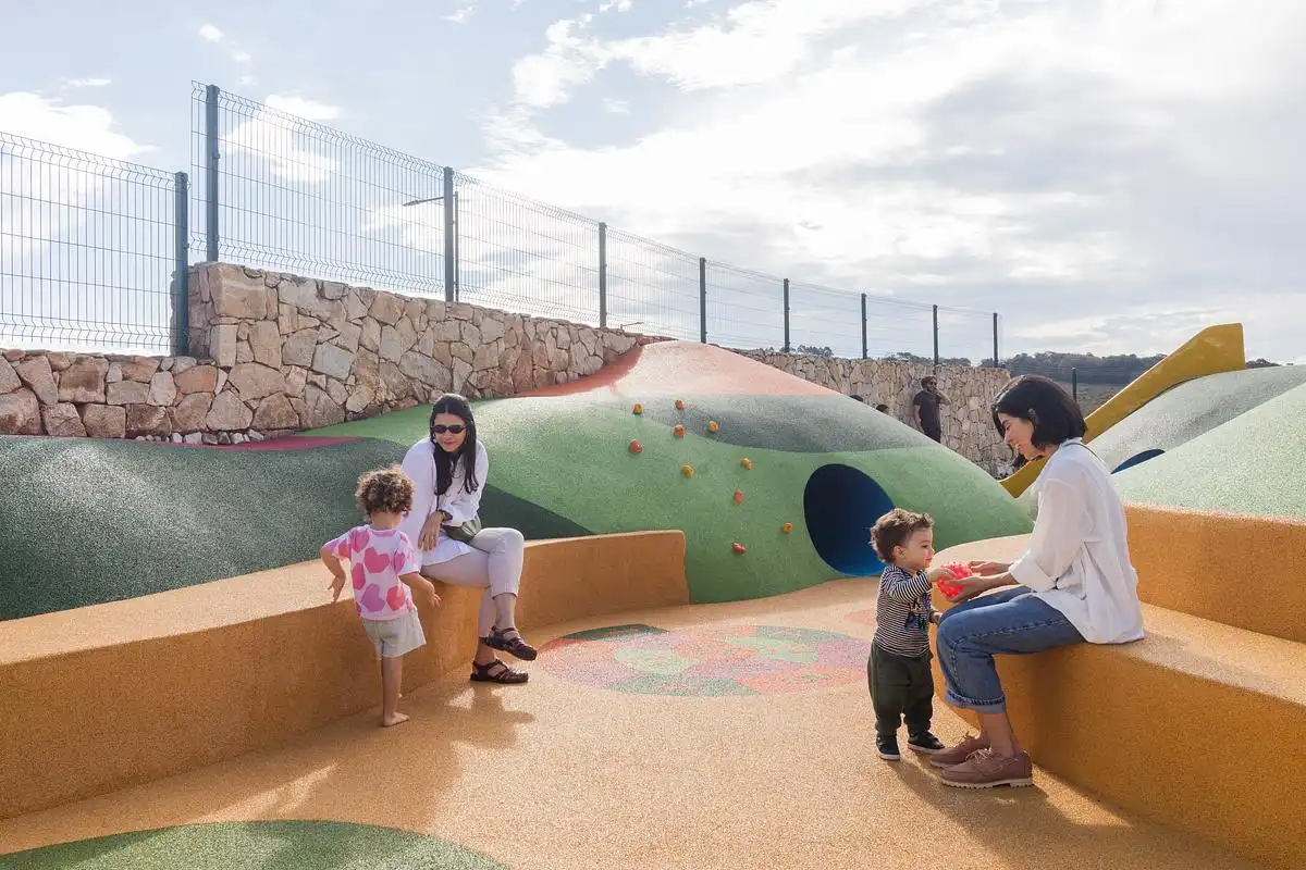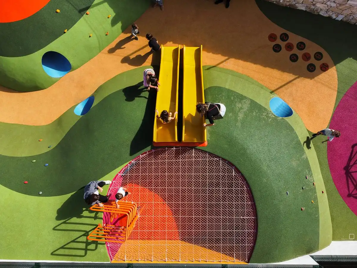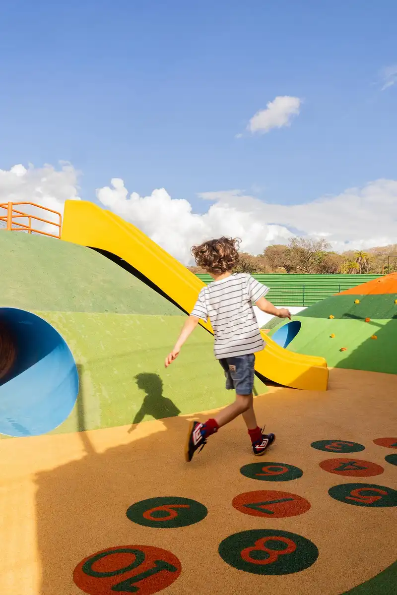 Based on the diagonals of the trapezoidal site, paths and sectors were defined, creating an active topography that becomes part of the playful dynamic. Collective slides, tunnels, climbing elements, and small hiding spots compose a scenario that stimulates children’s bodies and curiosity, while an amphitheater, a stage, and seating areas welcome parents and caregivers. The result is a space of intimate scale but full of possibilities — a small world of discoveries.