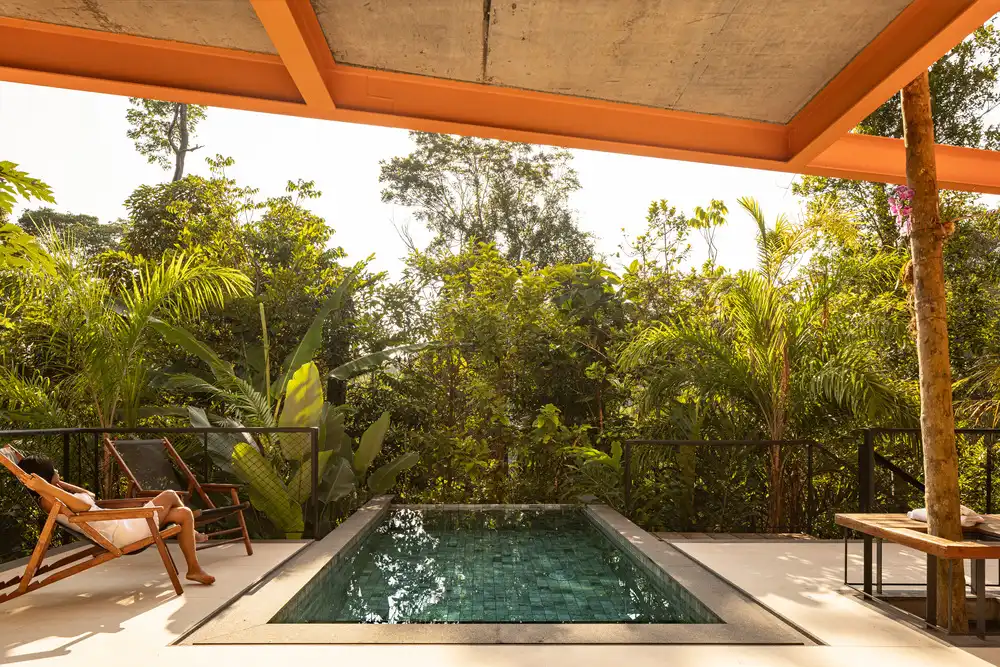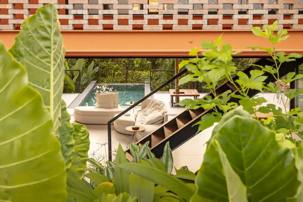 Arrival is framed as a sensorial experience: visitors follow a path immersed in tropical vegetation, where large foliage, natural shade, and rich textures create a fresh, humid microclimate. This immersion continues inside the residence, as greenery extends into the architecture and follows the circulation routes, integrating nature into everyday life.