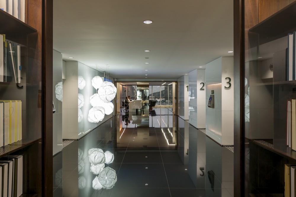The conference rooms are placed on both sides of the reception and along with the main façade turned to the view. A sculptural lighting fixture designed by Frank Gehry completes the elevators lobby lighting and give a sense of movement to all.