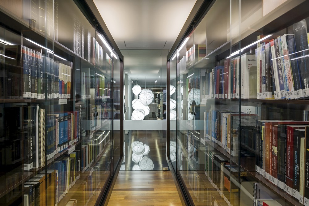 On the opposite side of this axis is a secondary access for employees that pass between suspended shelters, configuring the library. Behind the library, a wide space with shared tables forms the work area, that is surrounded by many private lawyer’s rooms.