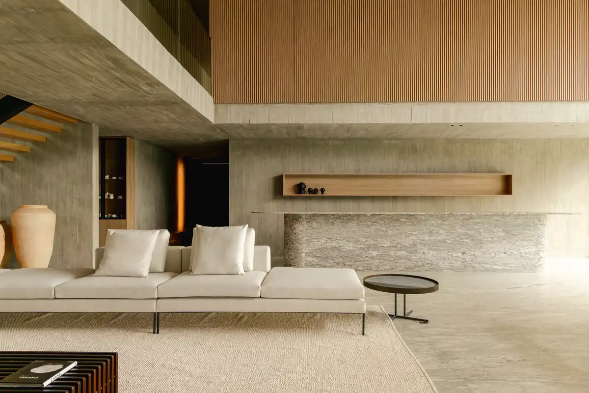 No nível inferior se concentram os espaços sociais, sala, cozinha, área gourmet, adega e piscina, todos voltados para o lago por meio de grandes panos de vidro e varandas generosas. Parte desse programa se encaixa no próprio muro de arrimo, onde estão cozinha de apoio, banheiro e adega, criando uma espessura habitada entre casa e terra. Nesse pavimento, o contato com a paisagem é direto: a água da piscina parece prolongar o espelho do lago e o interior se estende para o exterior sem limites claros.
