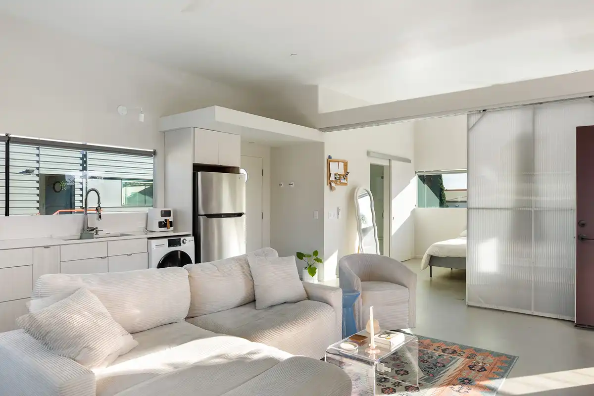 The property is comprised of a renovated vintage 1920s bungalow at the rear of the site and three newly constructed stand-alone structures at the front—each featuring a one-bedroom apartment above and a studio workspace below—woven together by landscaped outdoor gardens and courtyard spaces.