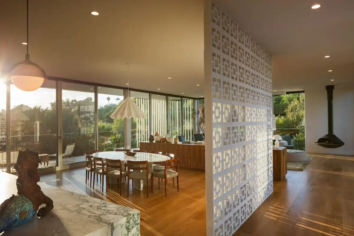 The resulting views are that of a private interior courtyard, existing pond, drought-tolerant and low maintenance grounds, and those stunning California sunsets. Custom airfoil blades surround the main structure and provide privacy from neighbors while allowing the homeowner to enjoy the views.