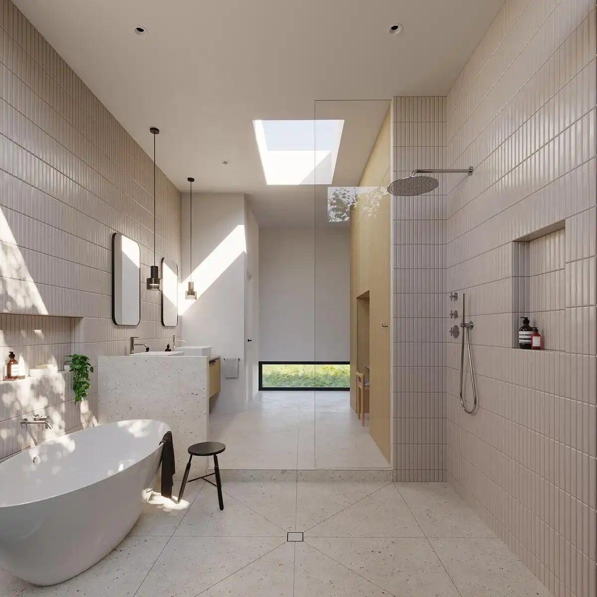 The primary bathroom is a place of rejuvenation inspired by the Japanese outdoor onsen bathing custom that borrows the outdoor natural elements as part of the serene bathing experience.