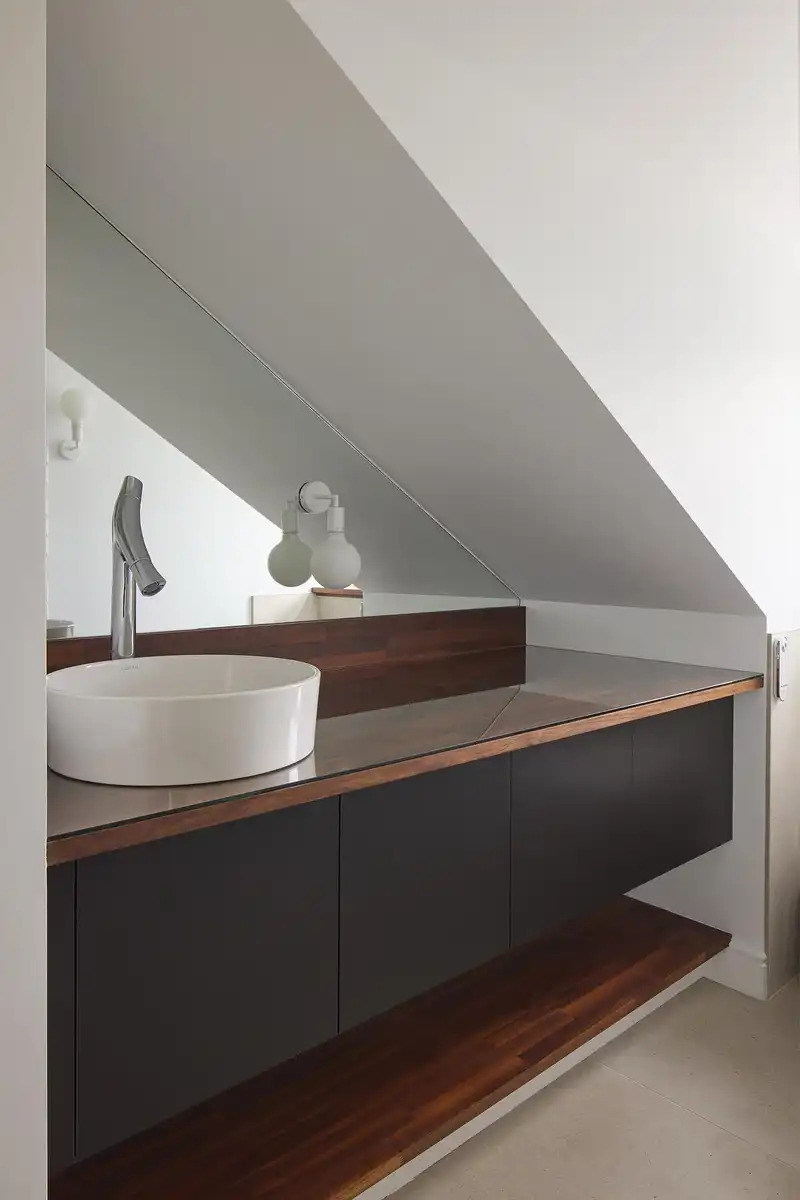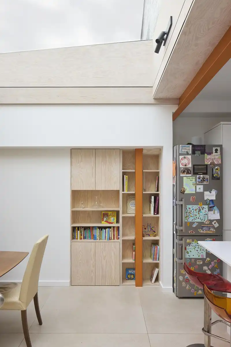 Internally some bespoke douglas fir joinery is highlighted with a sense of fun and pops of orange to the supporting steelwork.