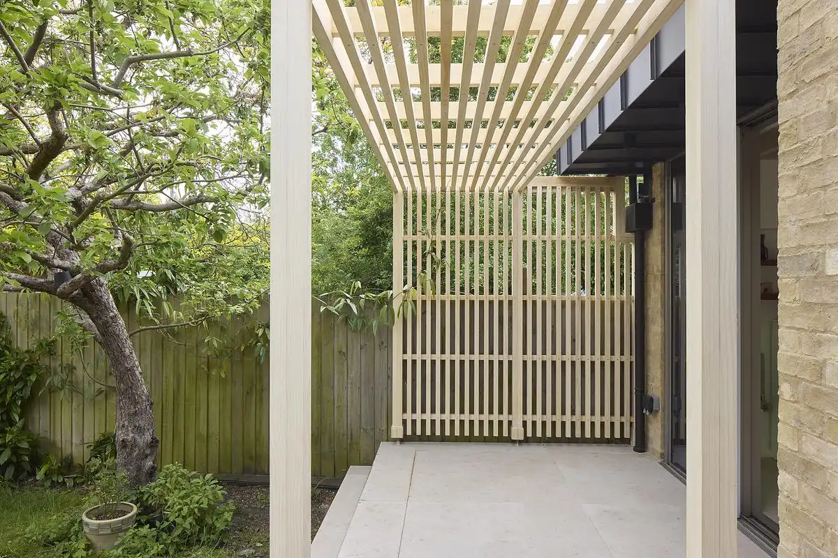 Oversized Sliding doors onto the garden flush to the floor are finished in a natural aluminium complimenting the colour tones, Large format porcelanosa flooring tiles used internally extending to the outside raised patio. Externally a natural finished accoya pergola allows for privacy and shading to the rear.