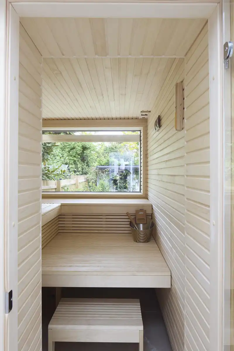 Side access leads to a new functional boot room with built in bench and cupboards leading to a central shower and bespoke sauna with views overlooking the garden.