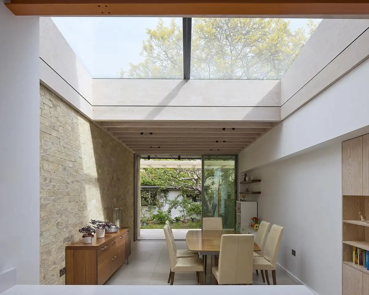The extension although modest has a loft airy feel with a stepped flat roof growing in height to add to the feel of space.