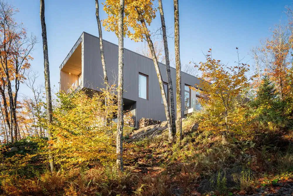 A small rustic cabin on a rugged lakefront site in Muskoka, this contemporary home transport visitors into an immersive wilderness experience.