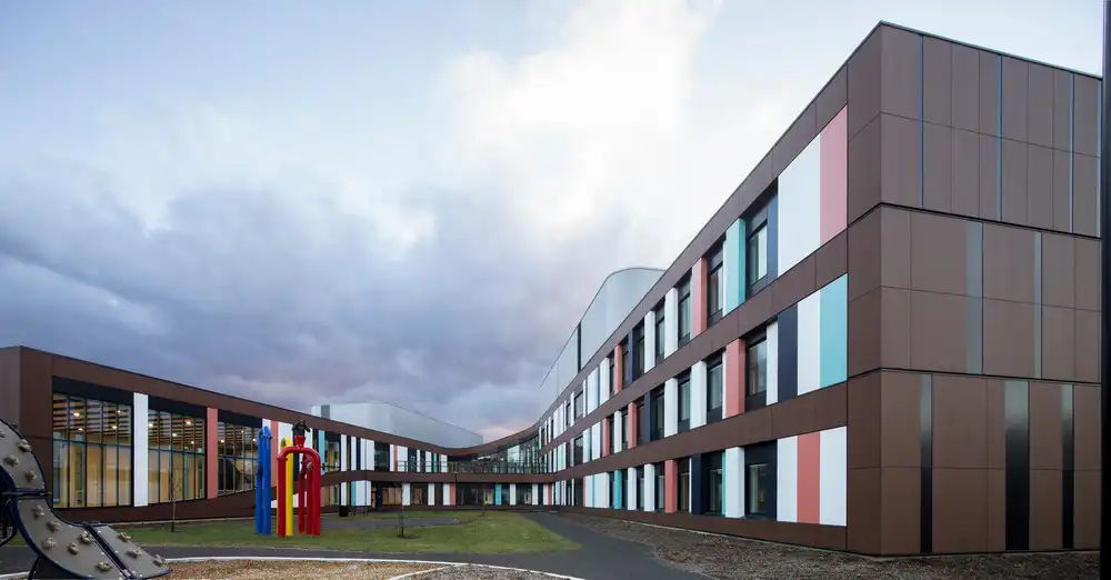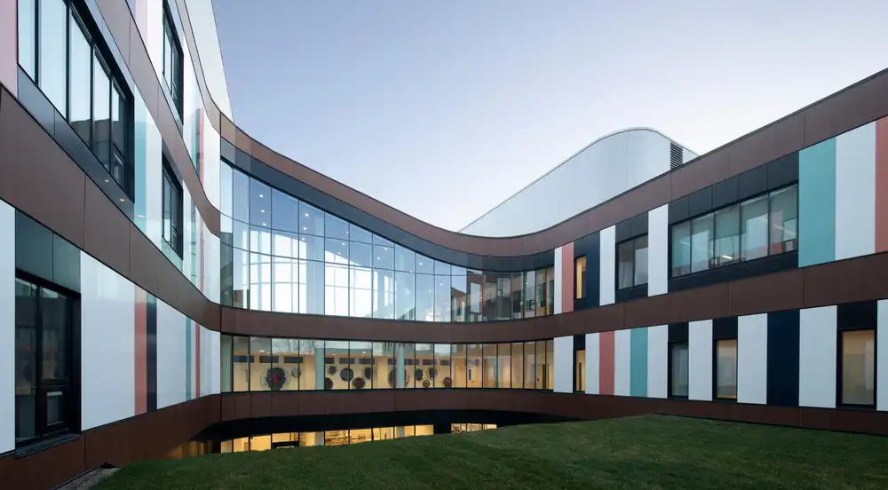 Complementing this is a facade of pastel-toned panels, arranged in a random, yet rhythmic pattern. This play of soft, non-hierarchical colors creates a subtly vibrant texture, deliberately breaking the monotony and rigid effect often associated with hospital, correctional, or strictly functional architecture. The building thus presents a more welcoming, more accessible face—almost playful, without ever being infantilizing.