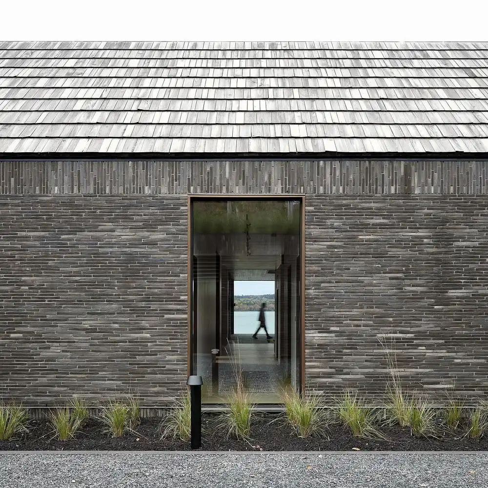 The natural material finishes, both inside and out, were carefully selected to age gracefully and slowly acquire a layer of patina to reflect the passing of time. The exterior walls use dark-toned, water-struck clay bricks sourced from Denmark, and the oversized roof shingles were custom-fabricated in a local workshop.