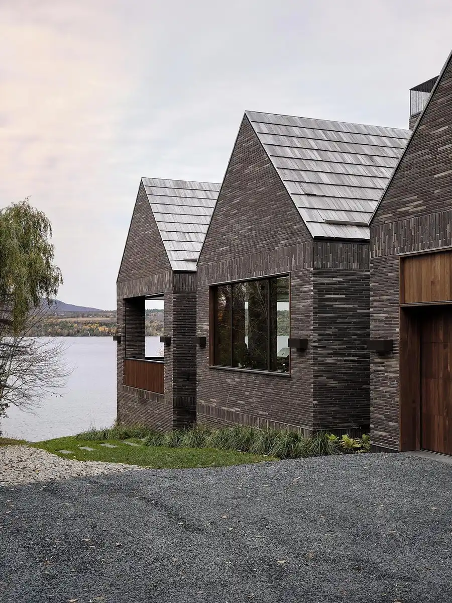 Sitting on the west banks of Lake Memphremagog, House on the Lake is a contemporary reinterpretation of the traditional barn volume typical to rural Quebec. The design repeats the prototypical form in four different articulations—an outdoor summer home, an indoor winter home, a living quarter, and a guest quarter. Cedar roofs, brick walls, and glass bridges tie the four volumes into one singular experience.