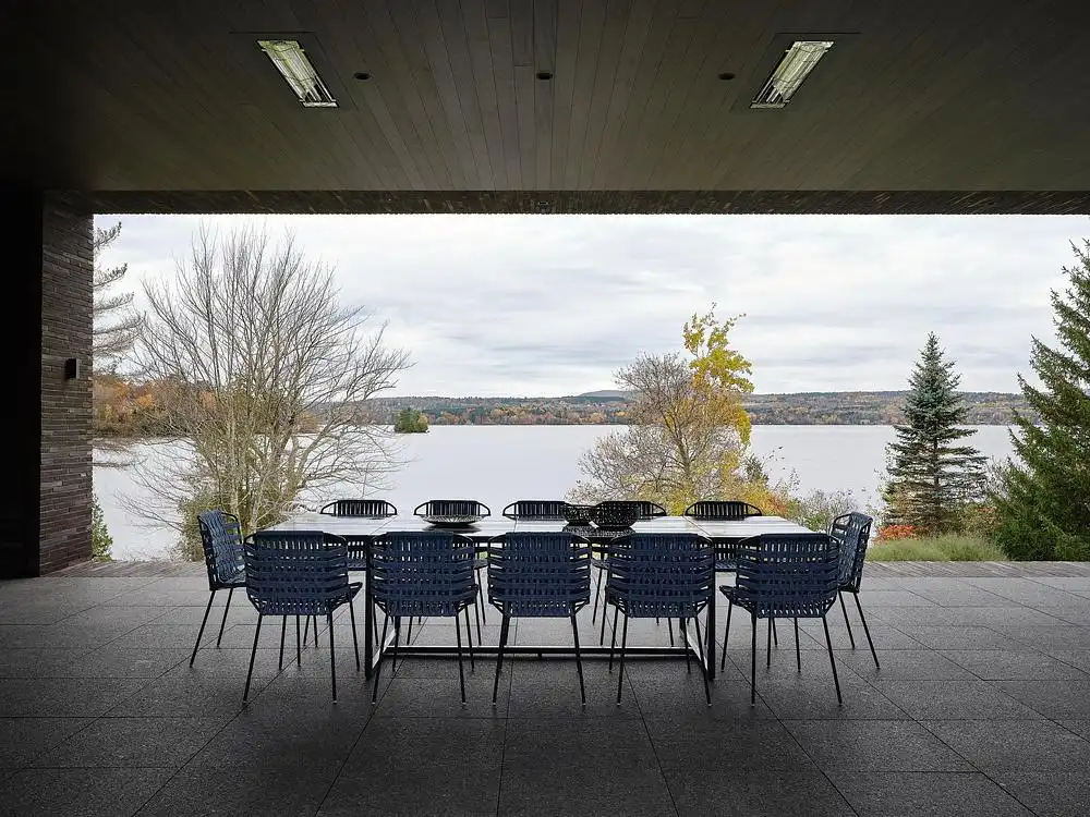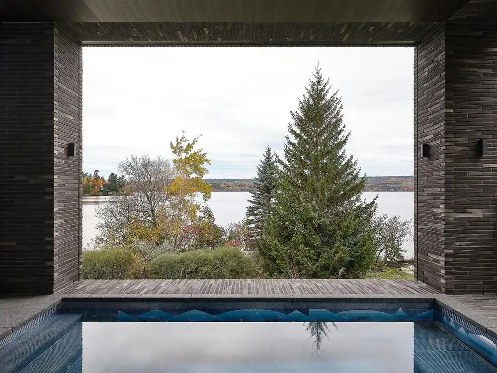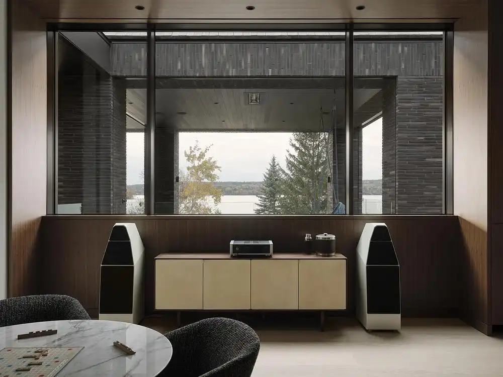 House on the Lake is constructed in reinforced concrete, steel framing, and brick infill walls. A structural system was devised to install motorized glass spanning more than 50 feet to capture an uninterrupted view of Lake Memphremagog and the surrounding landscape. The 11-foot-tall wood entry door opens into an art gallery and frames the lake. The open plan kitchen features fully glazed windows, replacing any above-the-counter cabinetry.