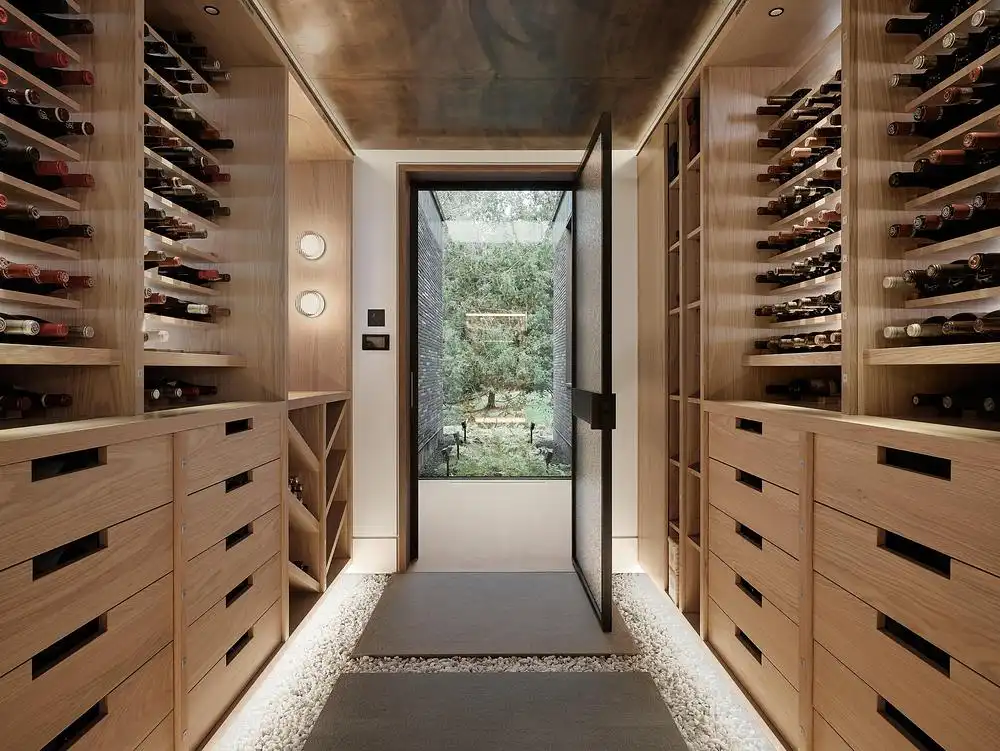 The wine cellar houses in excess of 1,200 bottles, specifically biased toward the unique shape of a Bourgogne bottle. The micro-fluted glass-and-bronze door gives into a space clad in white oak millwork compressed between a gravel floor and a bronze ceiling. Recessed lighting and bronze mirrors dramatize the interior with a warm glow and reflections throughout.