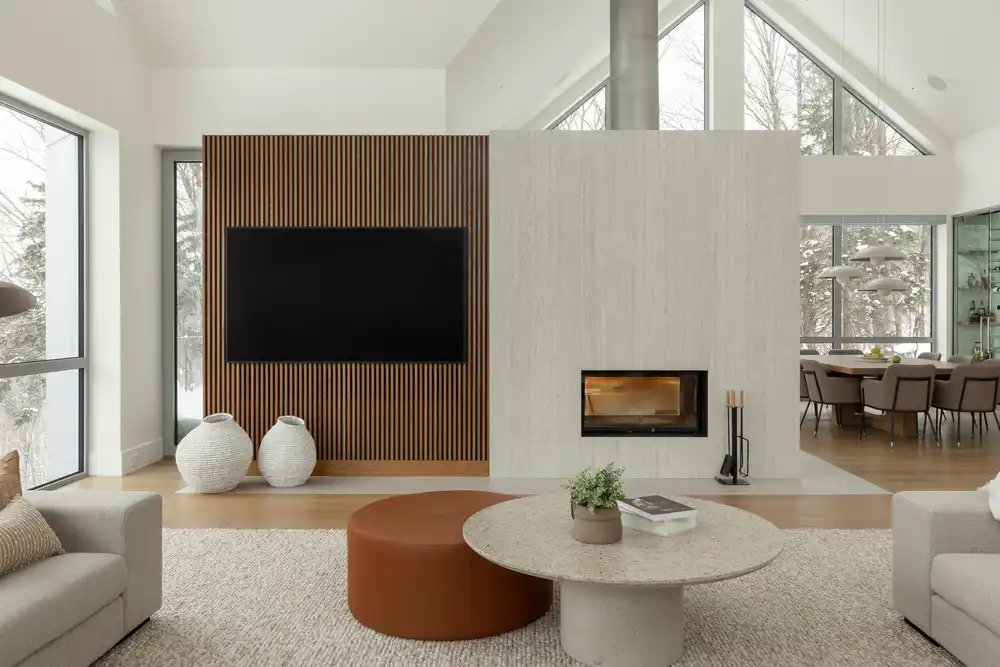 Inside, the common areas share an open space, all of which enjoy the splendid landscape of the Eastern Townships. A majestic, double-sided fireplace divides the living area, bringing an intimate character to the dining room, which has windows on all sides.