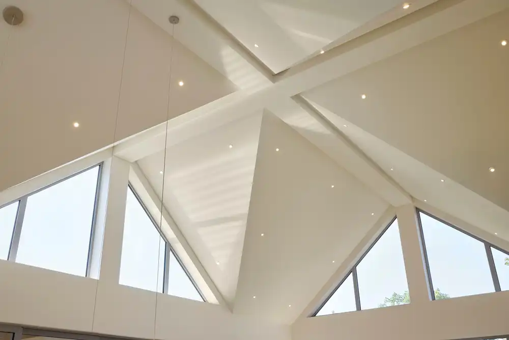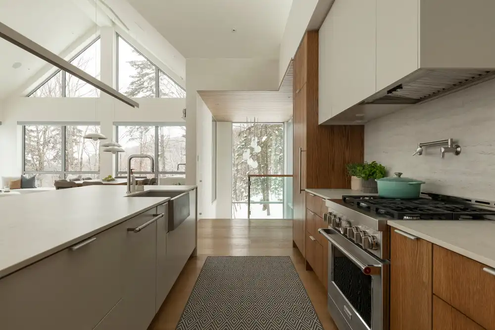 The residence’s architecture is both contemporary and classic due to the symmetry of its facades. A-shaped and triangular forms, signature features of the house, are found throughout to maximize vistas and sunlight. For instance, a triangular window above the kitchen allows zenithal light to flood the living area.