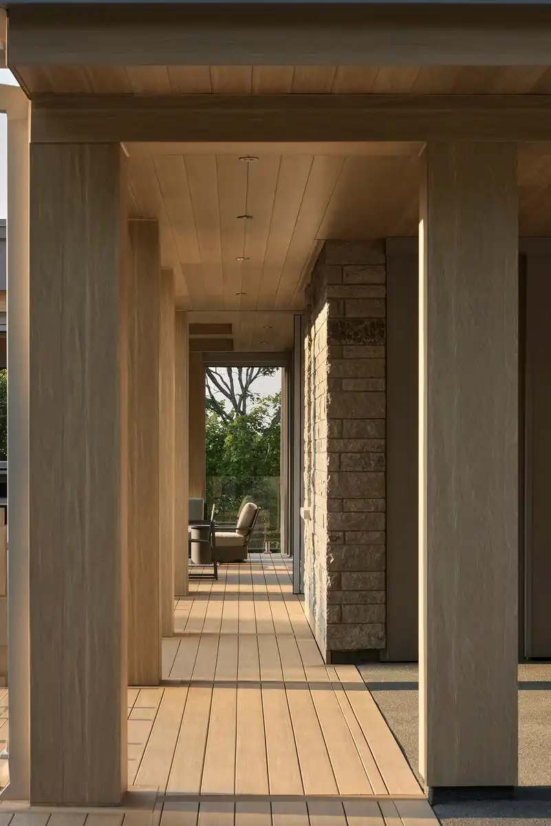 Anchored solidly to the site by massive columns, the residence boasts airy, luminous interior spaces.