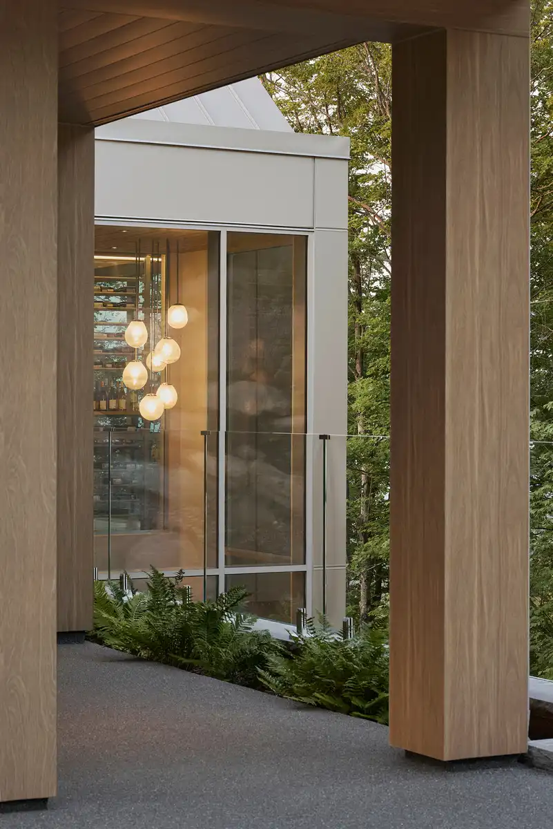 A path naturally traced by the slope around the site leads to the property and provides two access points. The first access point is at the level of the upper floor and leads to the main entrance, which is covered by a carport. The second access point discreetly winds through the woods to a secondary entrance below.
