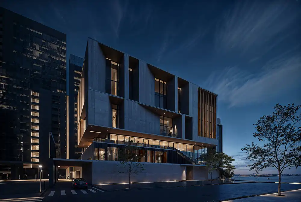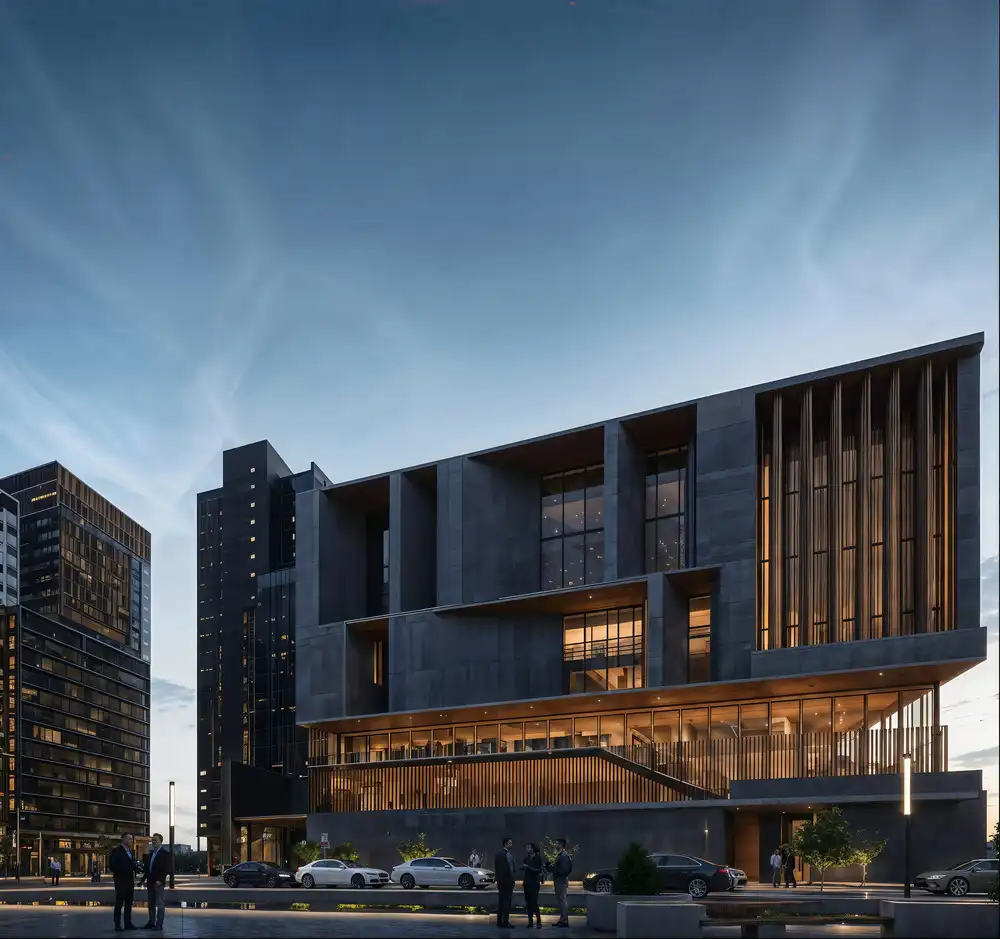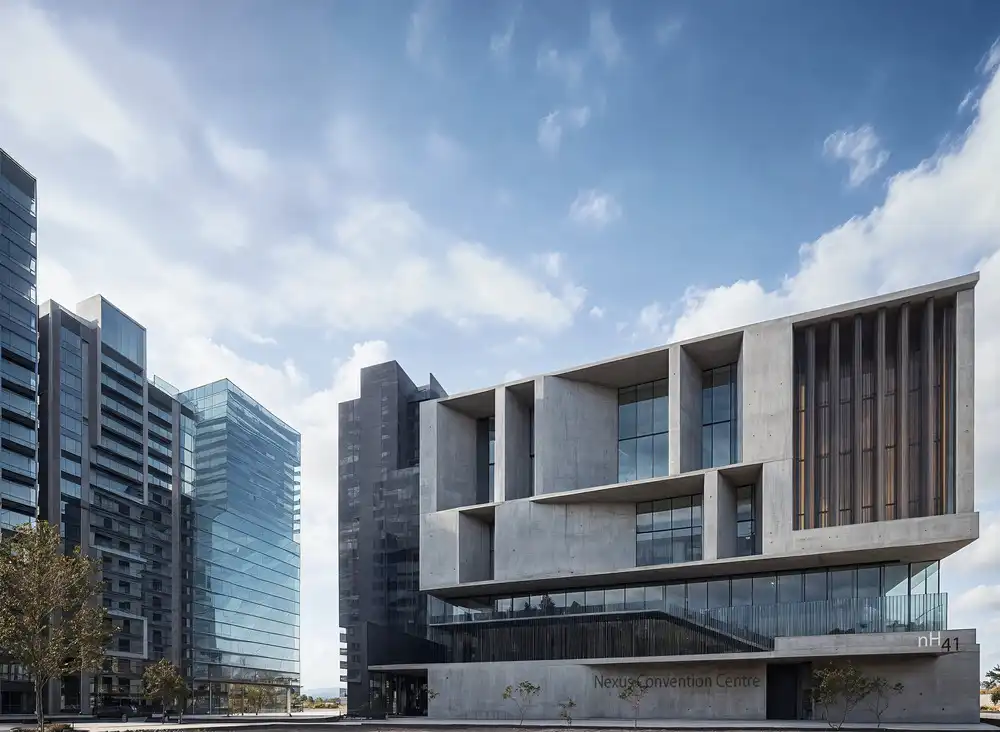 The design emphasizes sculptural clarity and civic presence. Its bold concrete form communicates permanence and importance, yet is tempered by expanses of glass and landscaped terraces that create transparency and welcome. The architecture avoids the stiffness of corporate buildings, instead projecting an image of inclusivity and openness.