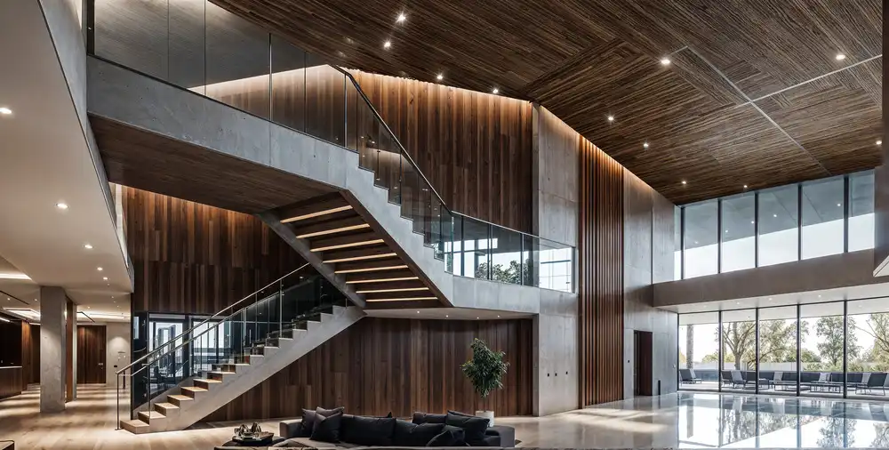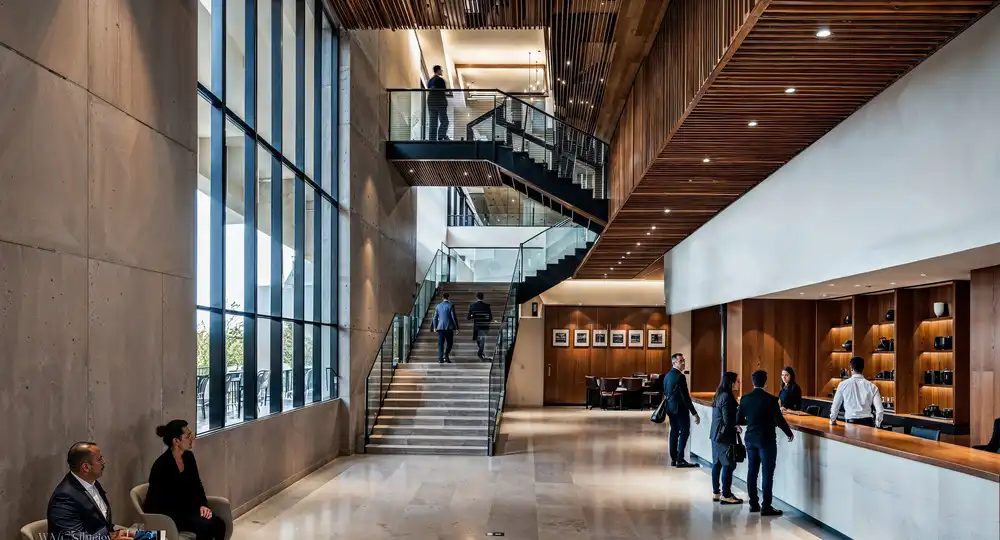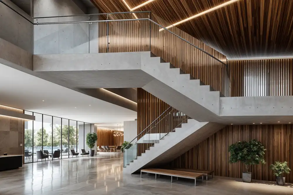 Interior Materials: Exposed concrete, warm timber baffles, acoustic ceiling treatments, steel and glass detailing