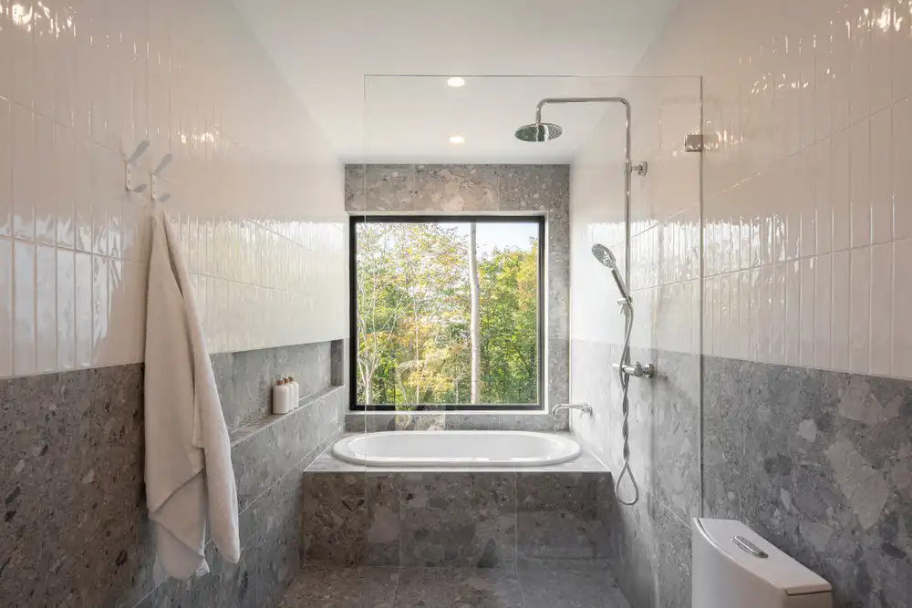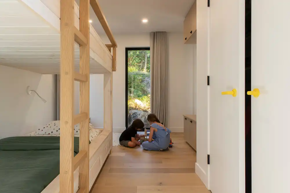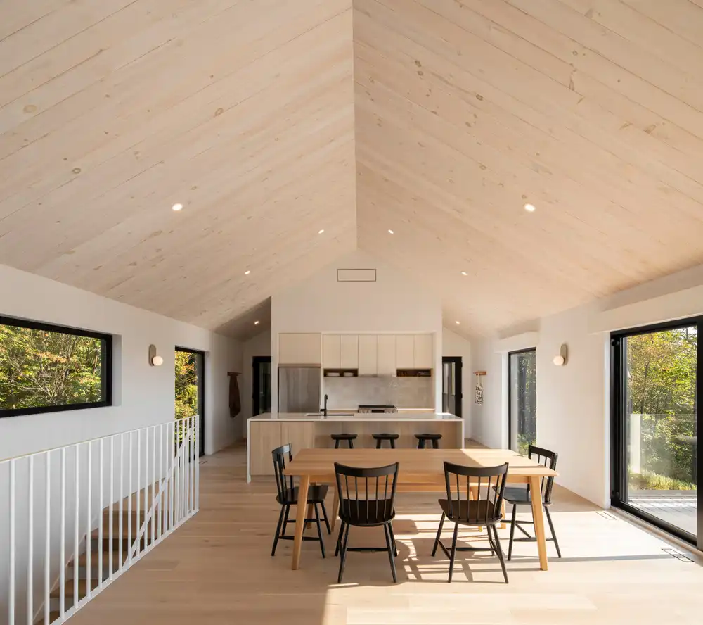 Le Noroît’s interior design is streamlined, with spaces that receive abundant natural light and passive solar heating through ample picture windows. The use of wood as the main finishing material, in muted colours, brings the house into harmony with the surrounding forest. The upper volume is finished in burnt timber (Yakisugi) and a black metal roof, while the interior walls are finished in red cedar and are insulated to current energy efficiency standards.