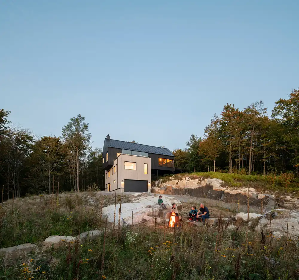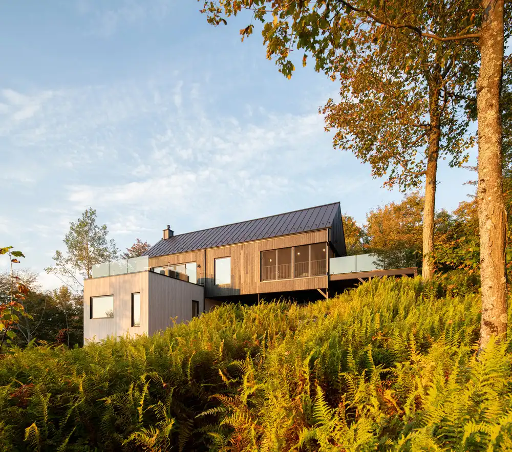 Le Noroît is a contemporary residential project for a family of four, located on a 10-acre property in the Laurentians. The home’s volumes are inspired by vernacular architecture, but are arranged spectacularly: part of the project is aerial, resting delicately on the ground so as to protect the natural site. The residence is suspended over the landscape, making it a peaceful oasis in the heart of the forest.