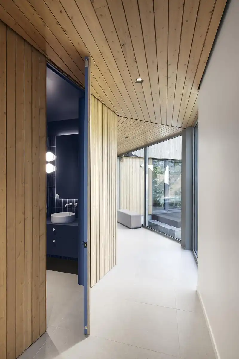 The placement of the volumes also generates a sequence of distinct outdoor spaces. A first courtyard marks the approach to the building and gathers the entrances to both residences. To the west, the angling of the pavilions creates a sheltered inner courtyard, open toward the river and protected from prevailing winds, which accommodates the swimming pool. This configuration forms an intimate, sunlit outdoor room with river views, concealed from the interior spaces and ideally positioned within the regulatory setbacks.