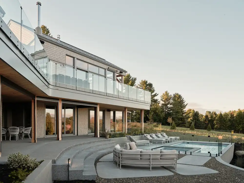 Located in Georgeville, in the Magog region of Quebec, this approximately 4,000 sq. ft. residence is composed of three main volumes connected by curved passageways. Designed by MUUK Architecture, the house integrates naturally into the terrain, evoking a former farmstead.
