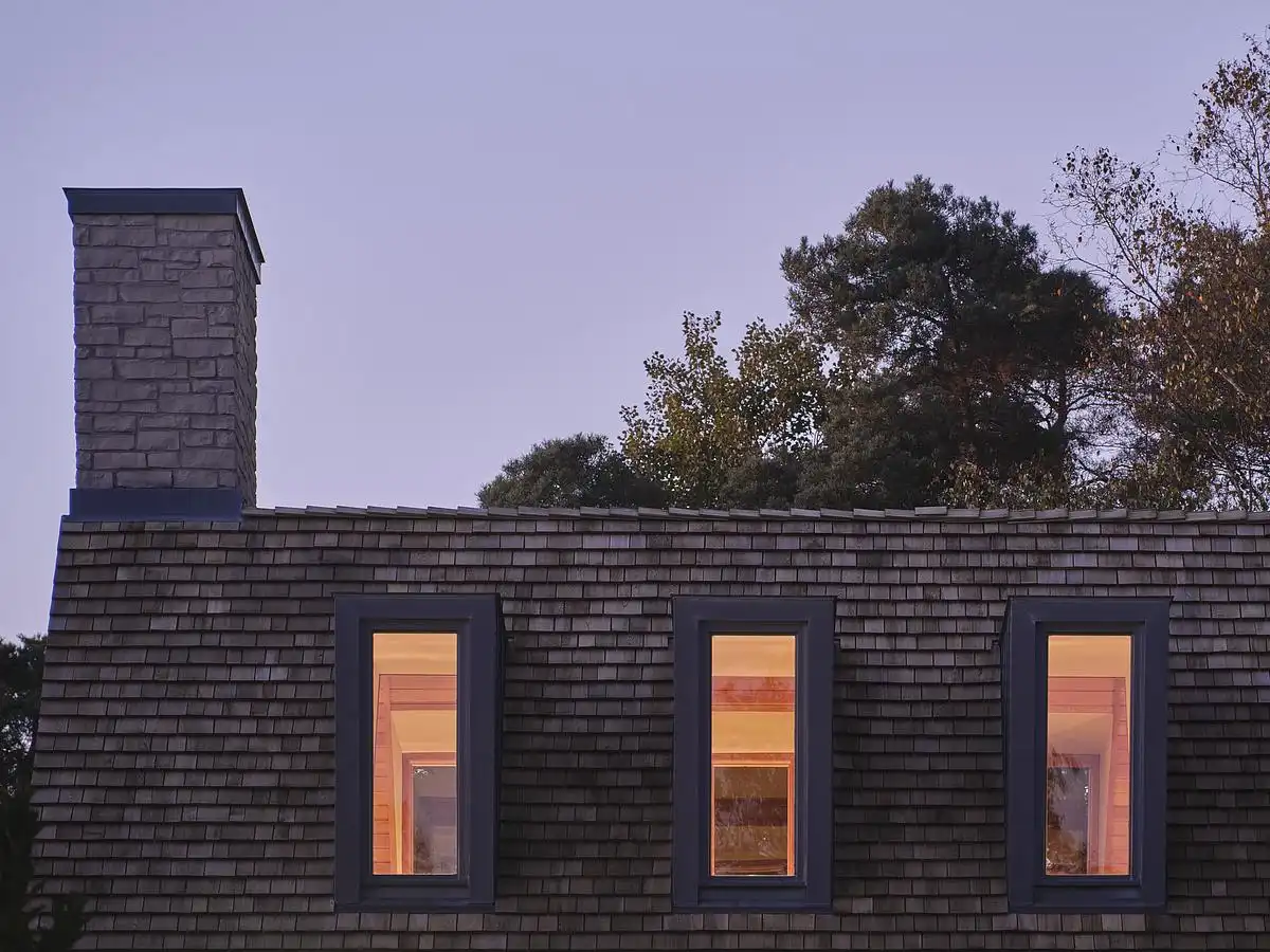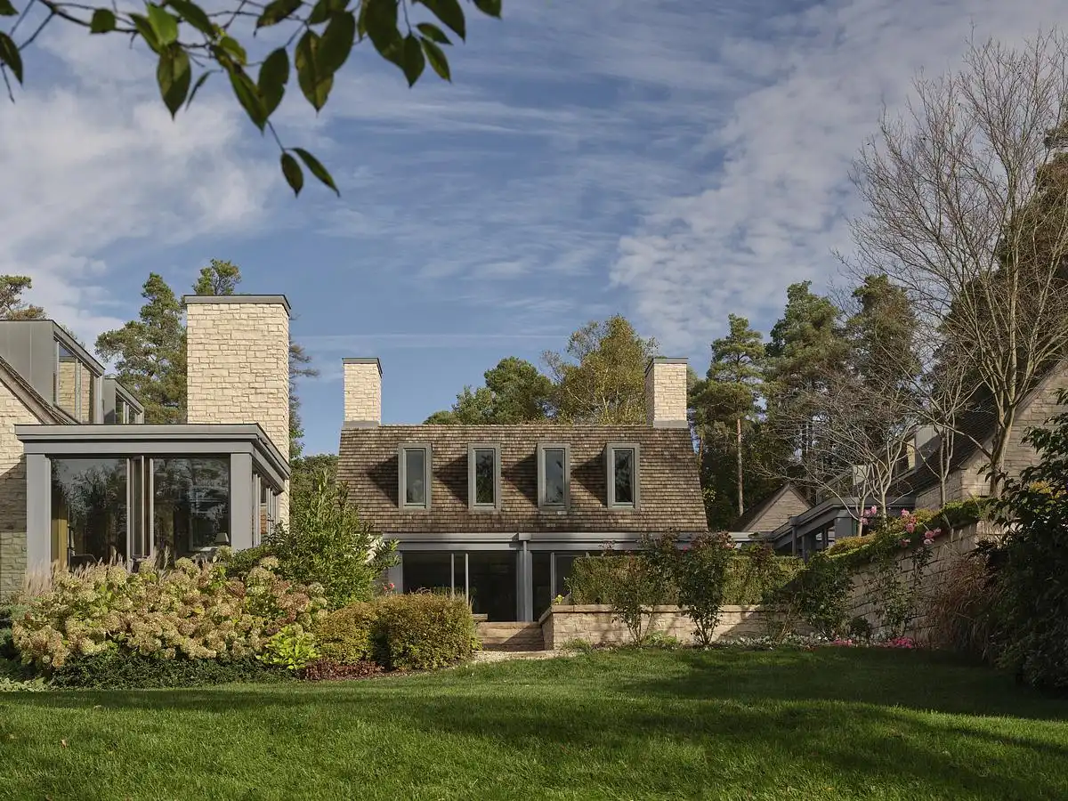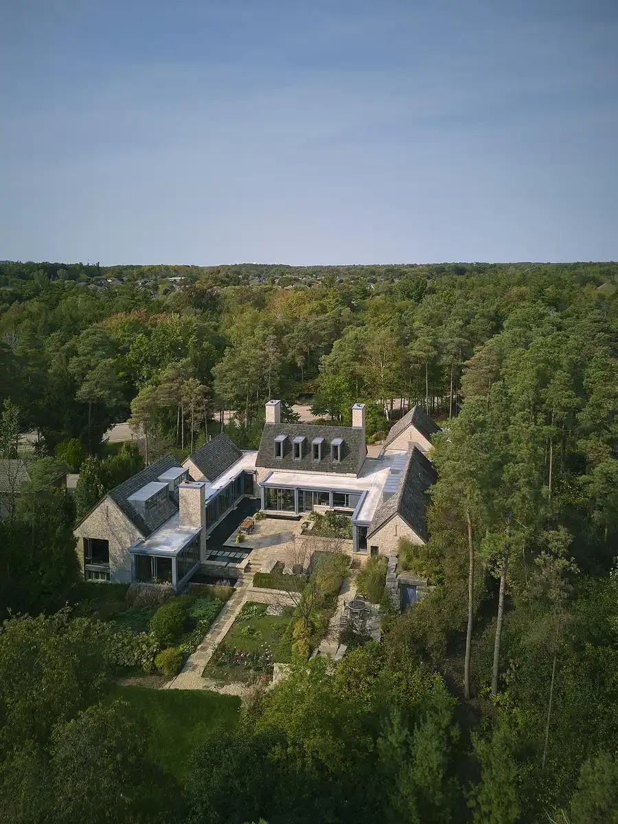 The architectural composition is defined by five gabled forms clad in locally sourced stone. These volumes are arranged across the site in a fragmented yet intentional manner, creating a rhythmic procession of masses that break down the overall scale of the house and embed it more comfortably within the residential fabric. Each gabled form contains a unique programmatic element—such as the kitchen, living areas, bedrooms, and guest suites—allowing the home to function as a series of interrelated pavilions rather than a singular monolithic structure.