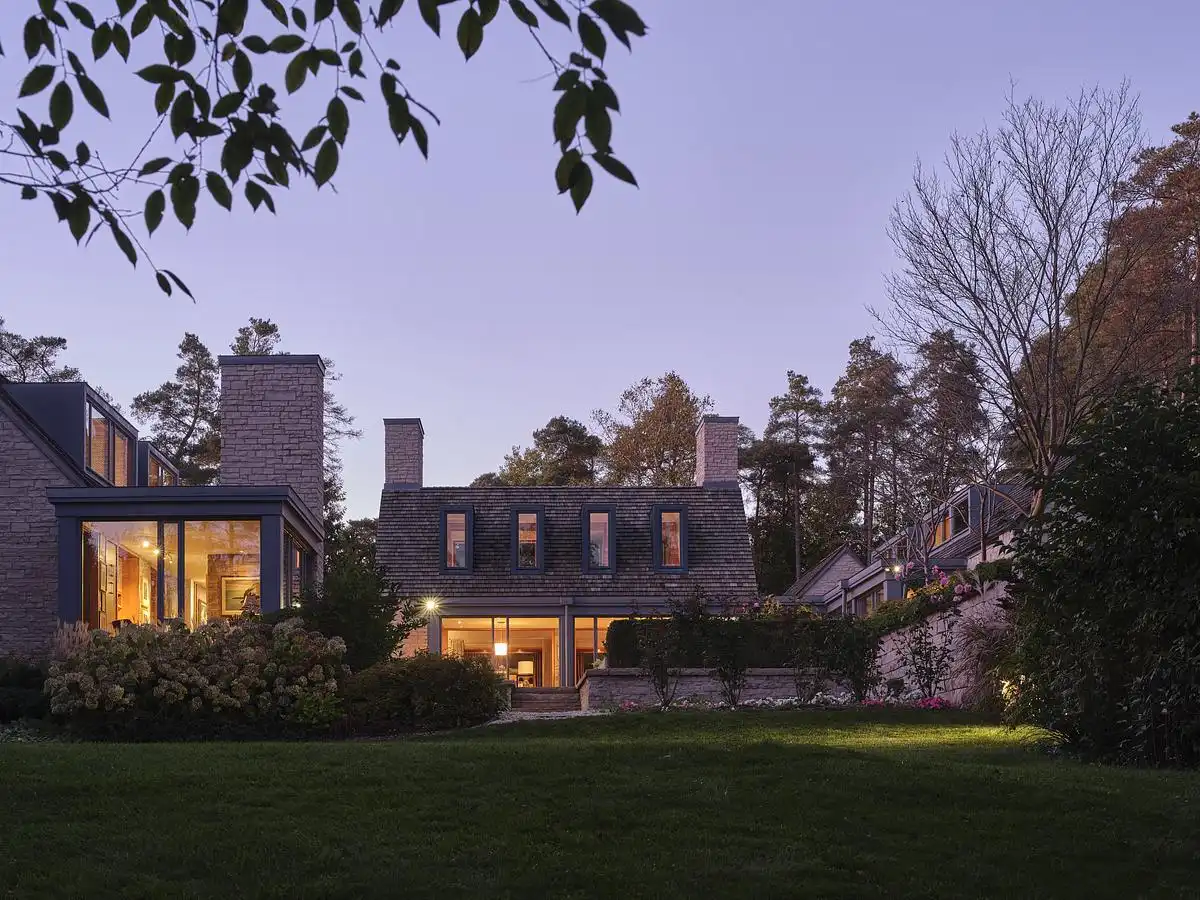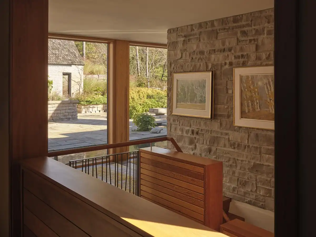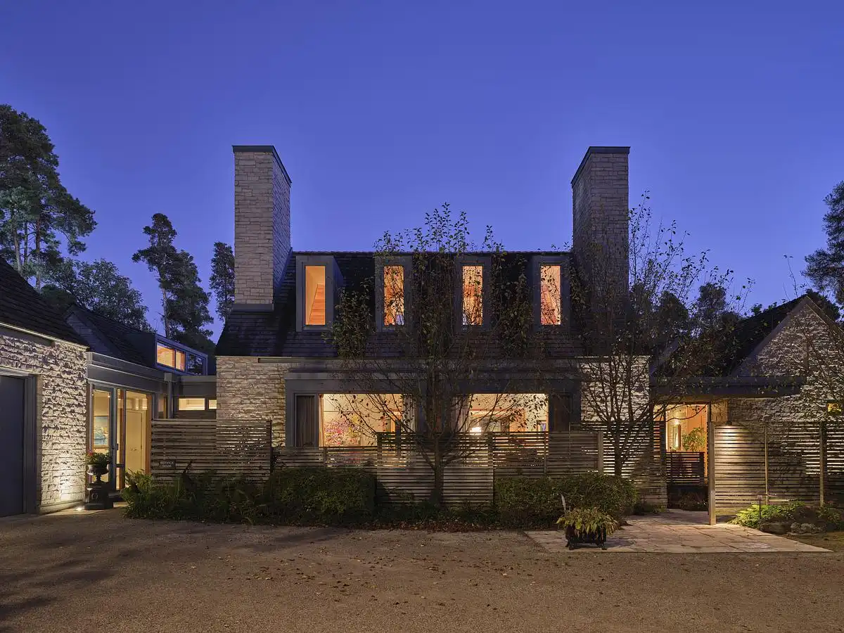 This fragmentary approach is inspired by the typology of rural agrarian settlements, where clusters of buildings serve different uses but maintain visual and spatial cohesion. The gabled roofs and stone cladding evoke the archetype of the Ontario barn, reinterpreted here in a refined, contemporary language. This strategy not only ties the residence to the regional vernacular but also brings a sense of timelessness and material permanence to the project.