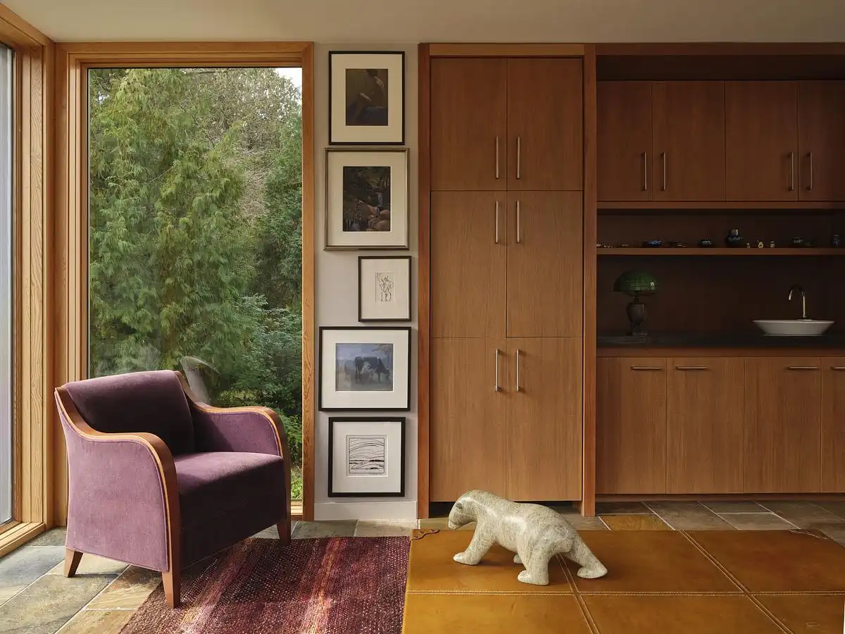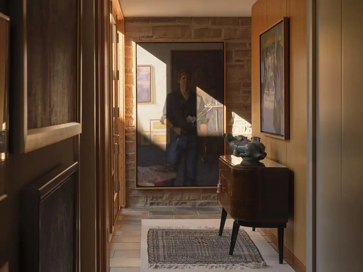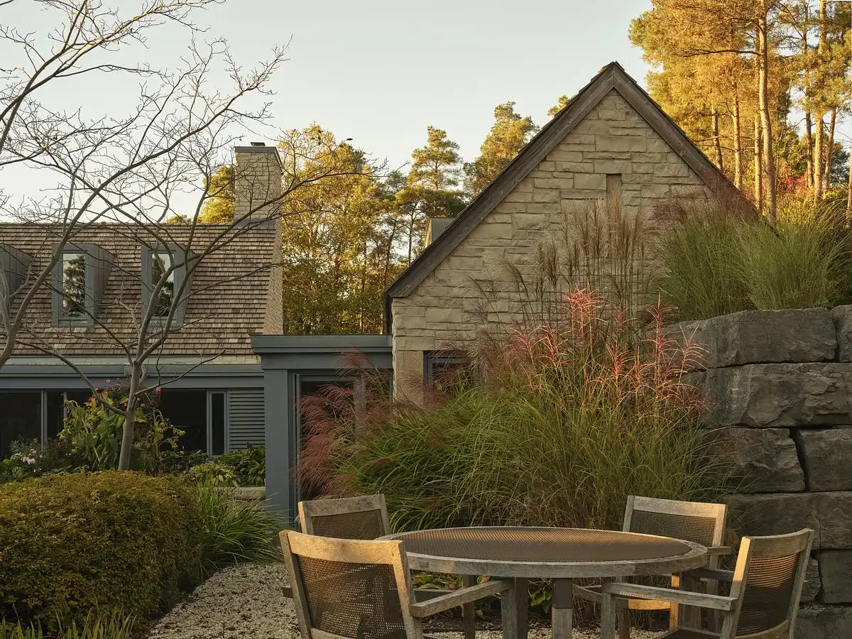 This fragmentary approach is inspired by the typology of rural agrarian settlements, where clusters of buildings serve different uses but maintain visual and spatial cohesion. The gabled roofs and stone cladding evoke the archetype of the Ontario barn, reinterpreted here in a refined, contemporary language. This strategy not only ties the residence to the regional vernacular but also brings a sense of timelessness and material permanence to the project.