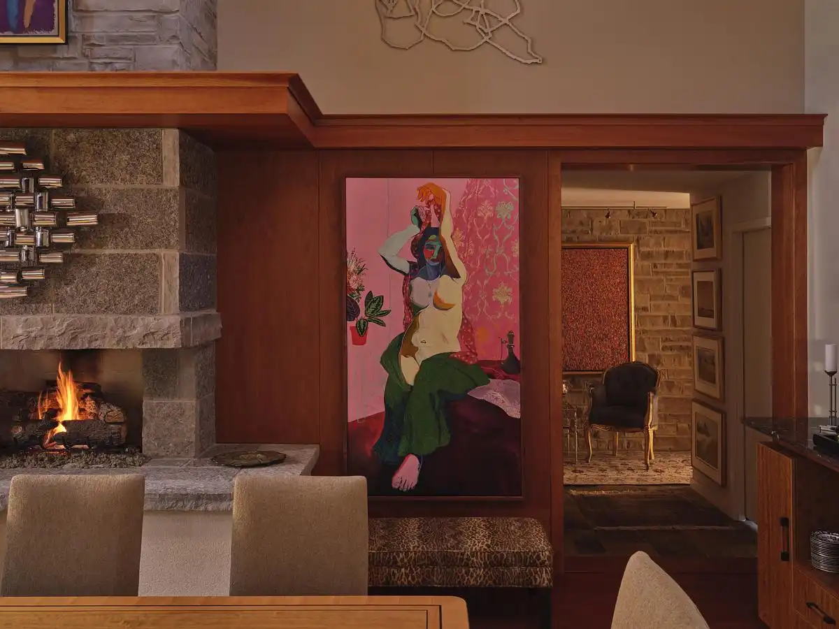The primary arrival sequence is marked by a pair of monumental stone fireplaces that stand sentry at the approach to the home. These elements frame the threshold to the central great room, the heart of the residence and its most public space. With its generous volume, vaulted ceiling, and strong material presence, the great room serves as a gathering space that is simultaneously grounded and expansive. The fireplaces themselves provide not only warmth but also a tectonic clarity that reinforces the architectural narrative of mass and lightness.