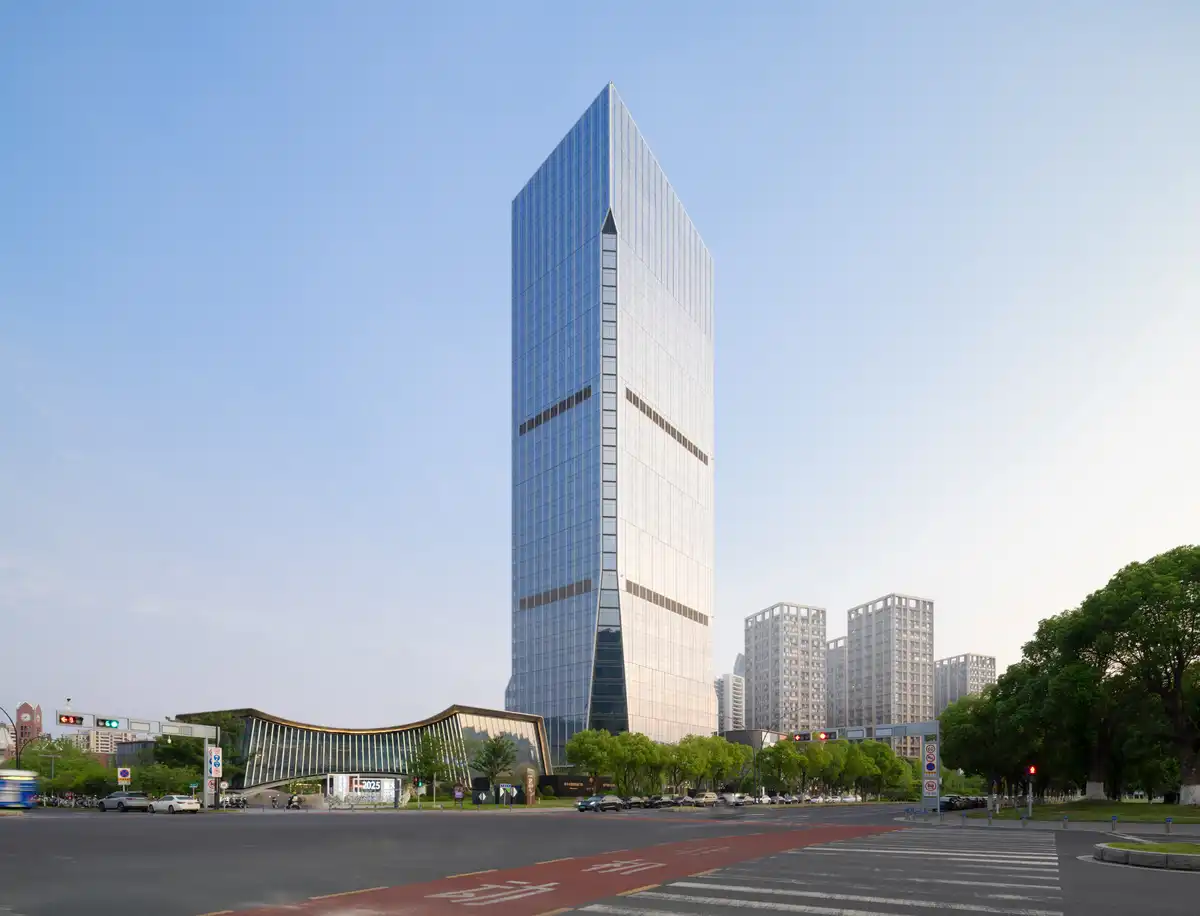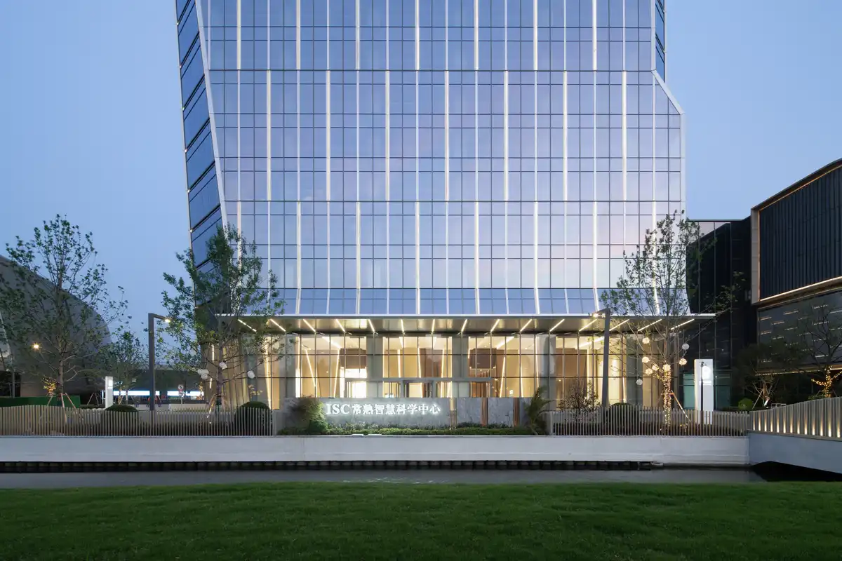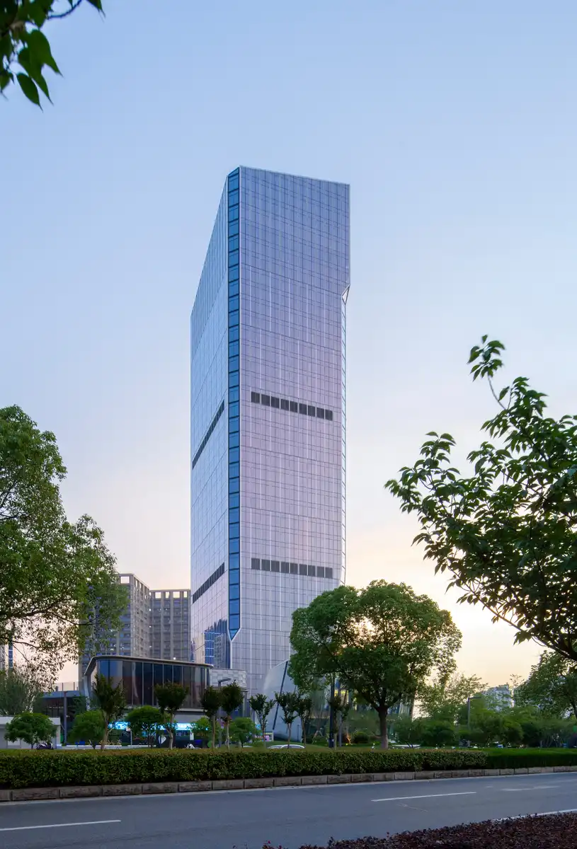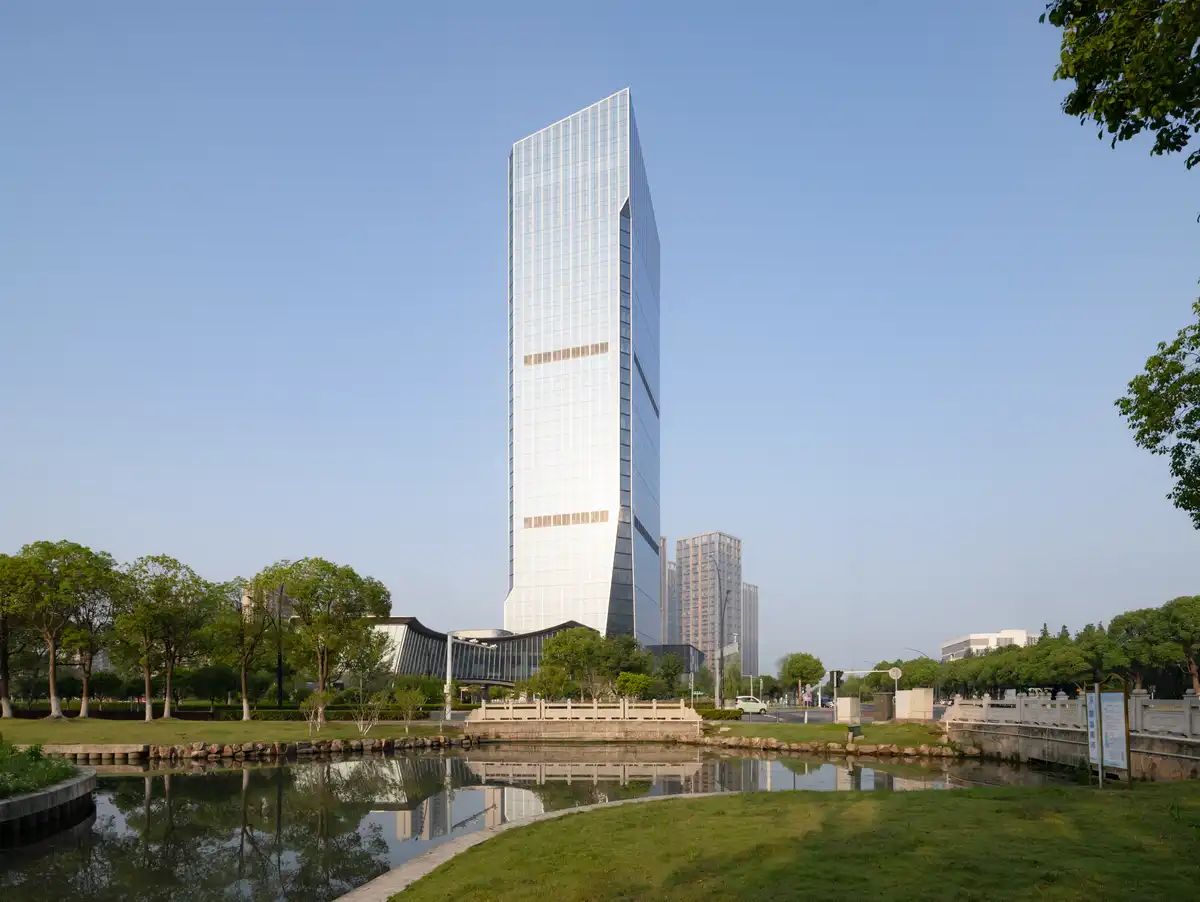 Inspired by Changshu’s cultural heritage, particularly the ‘Eighteen Views of Yushan’, the design reinterprets local landscape motifs through a contemporary architectural lens. The tower features a diagonally cut crown at the façade corner, creating a dynamic silhouette that appears suspended in mid-air. The façade combines Low-E glass with aluminium fins and concealed operable panels for ventilation, maintaining a sleek, modern aesthetic. Integrated lighting design enhances the landmark presence, with linear fixtures embedded alongside ventilation elements to outline the building’s form after dark.