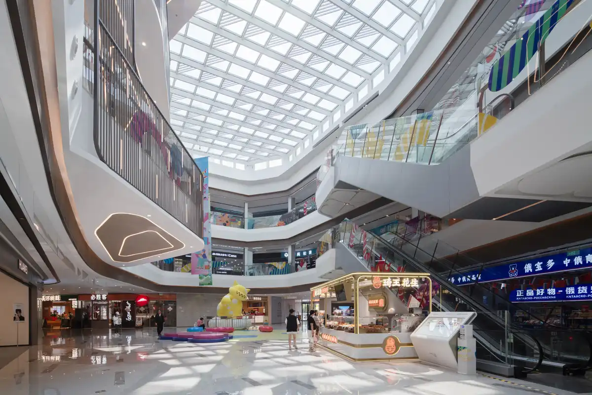 The retail design adopts a streamlined architectural form. The façade is articulated into three layers: a transparent ground-level glass curtain wall, a textured aluminium panel system, and a glass wall framed for signage. These overlapping elements evoke the interplay of mist and cliffside. Day and night views are holistically considered, with lighting seamlessly integrated into the façade’s texture. Two atriums of varying scales provide flexible space for exhibitions and events, while multiple entrances enhance accessibility. A skylight above the main atrium brings natural light deep into the interior, blurring the boundary between indoors and out.