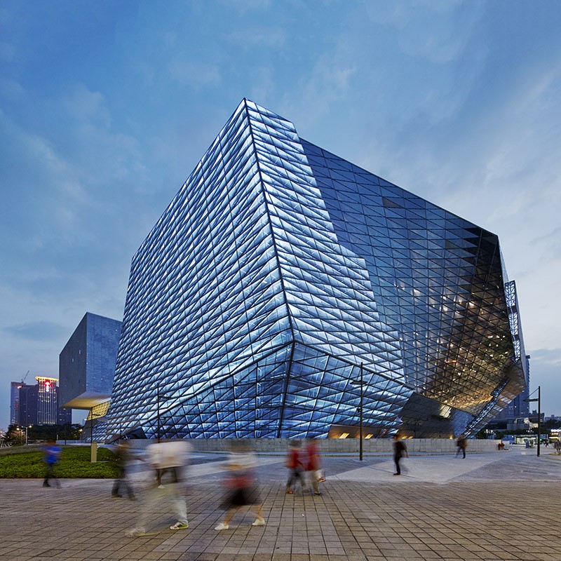 The building is an integration of the Shenzhen Museum of Contemporary Arts and the Urban Planning Exhibition Halls. Surface materials of glass, perforated plate, and stone extend and twist along the steel structure, creating a complicated architecture full of vitality.