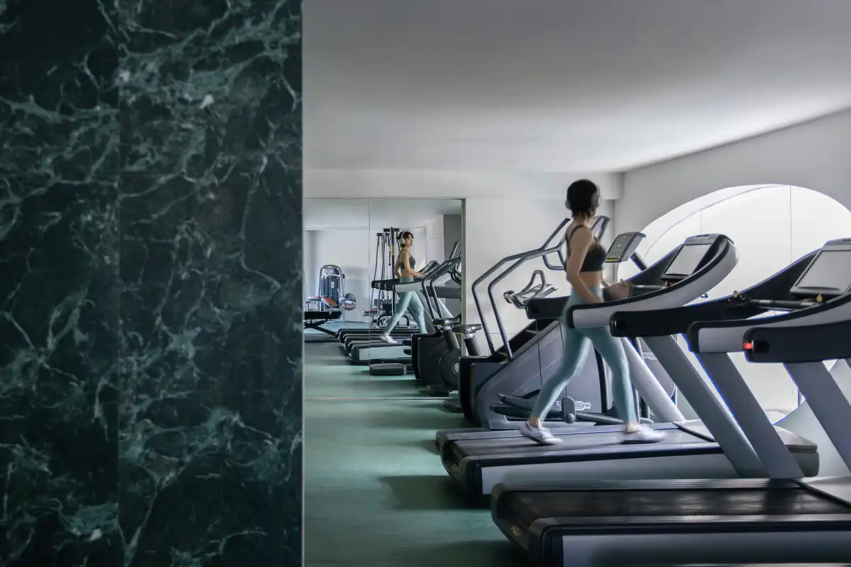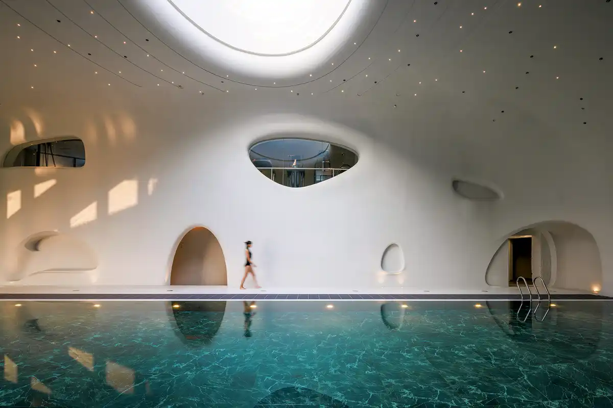 The gym on the second floor offers a superb view of the pool—as if peering from a small cave into a grander one, while also gazing beyond the rock into the surrounding nature. The outdoor hot spring pools are enclosed by terrain and vegetation for privacy, yet still offer a distant view of the Great Wall. At night, as lights twinkle above the pool, the cave transforms into a starry sky.