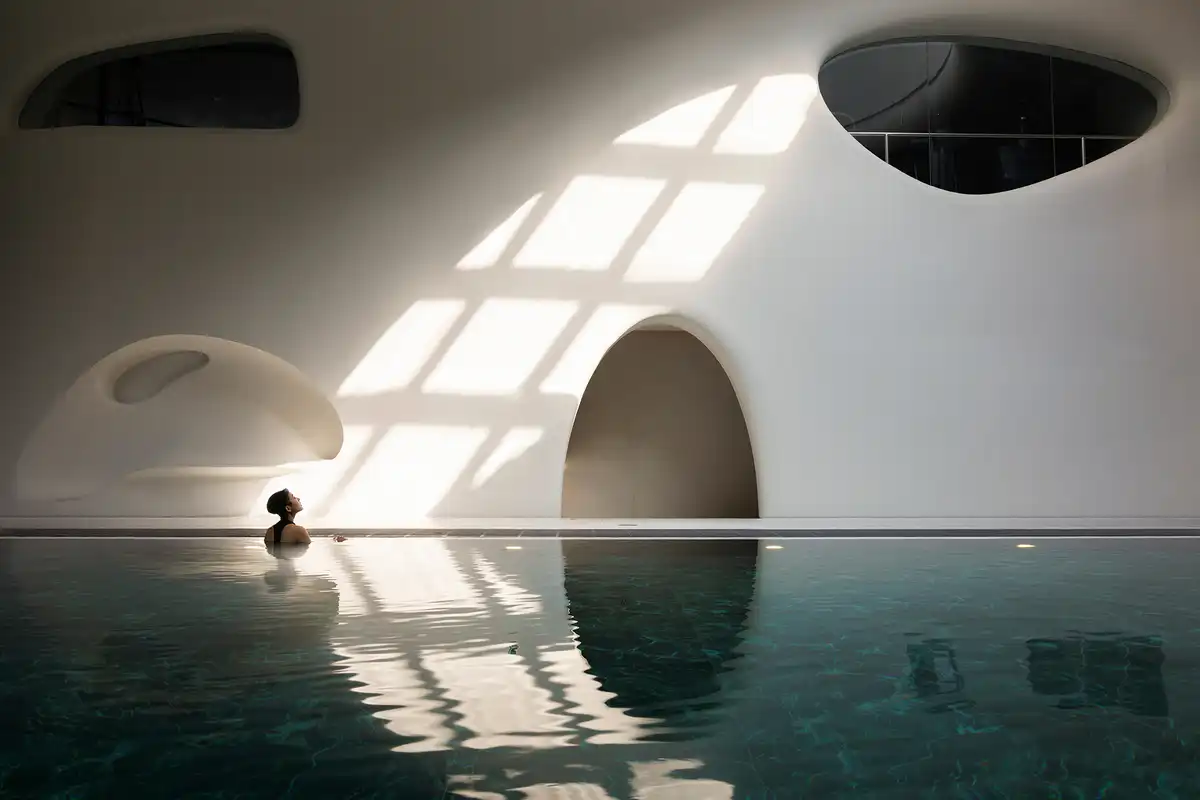 When snow blankets the mountaintop, all that’s visible are steaming pools and faintly spiraling curves. Nature becomes the true artist, transforming the center into a stone born of the mountain. The zigzagging landscape path connecting villas to the clubhouse is embedded in the earth—disappearing, reappearing, leading visitors into the experience from the very first step.