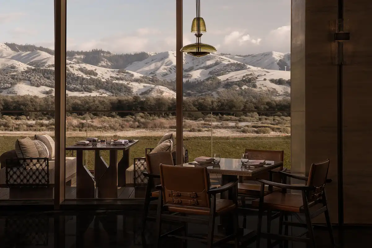 The space exudes a quiet sense of restraint, echoing the vastness and quiet composure of the grasslands. A sweeping curved window frames a boundless view, drawing the distant Nalati Grassland and the majestic Tianshan Mountains into the interior. Light becomes a poetic storyteller, tracing the shifting seasons across a brick-red canvas.