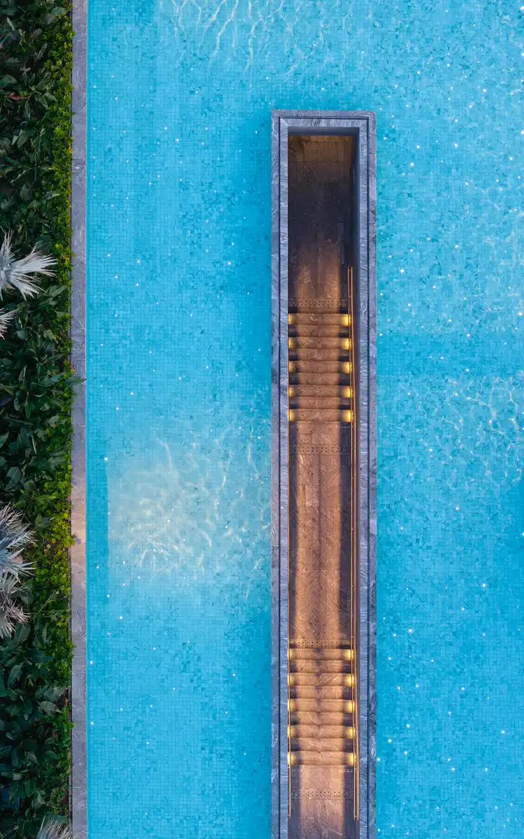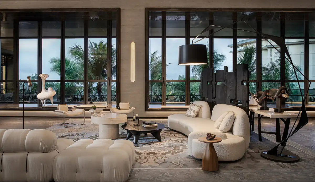 Defying conventional hotel programming, the lobby is redefined as an “Art Atrium,” “Living Room,” and “Leisure Balcony.” The reception zone, centered around a fireplace and encircled by organic curved furniture, creates a welcoming and open social environment. Seven infinity water features, numerous art pieces, and scattered tropical greenery invite guests to slow their pace and immerse themselves in the present moment.
