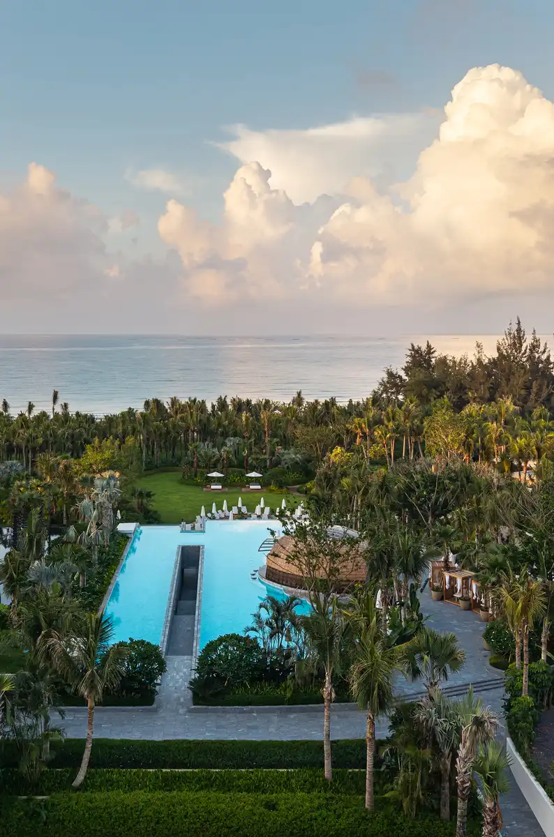 Kimpton Aqeos Hainan is nestled in Clear Water Bay, Lingshui County, Hainan. As the first Kimpton-branded resort in Greater China, it boasts pristine beaches, coconut groves, and breathtaking ocean views. Compared to neighboring Haitang Bay – a mature tourist destination with high-end hotels and commercial facilities – Clear Water Bay stands out for its untouched natural environment. The area features well-preserved tropical rainforest ecosystems, diverse marine habitats, and rare native coastal landscapes, making it Hainan’s most naturally enchanting luxury resort.