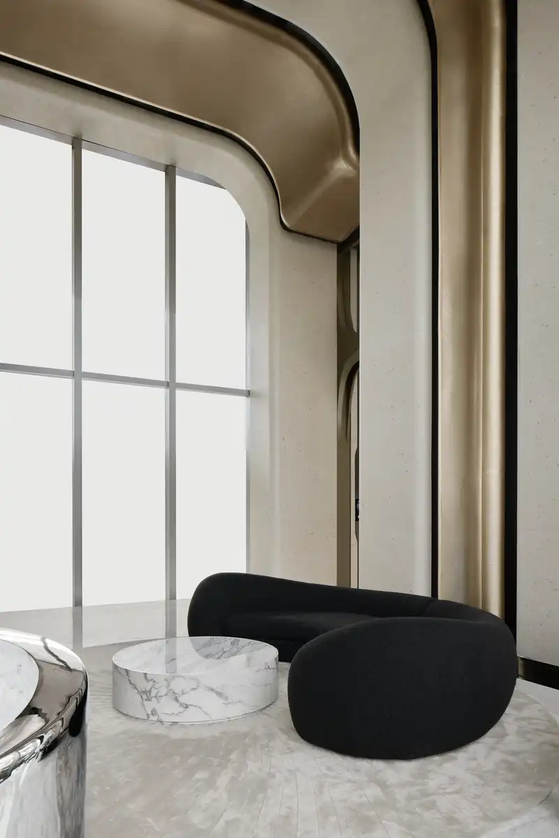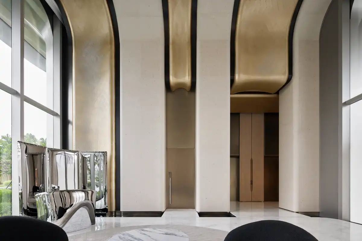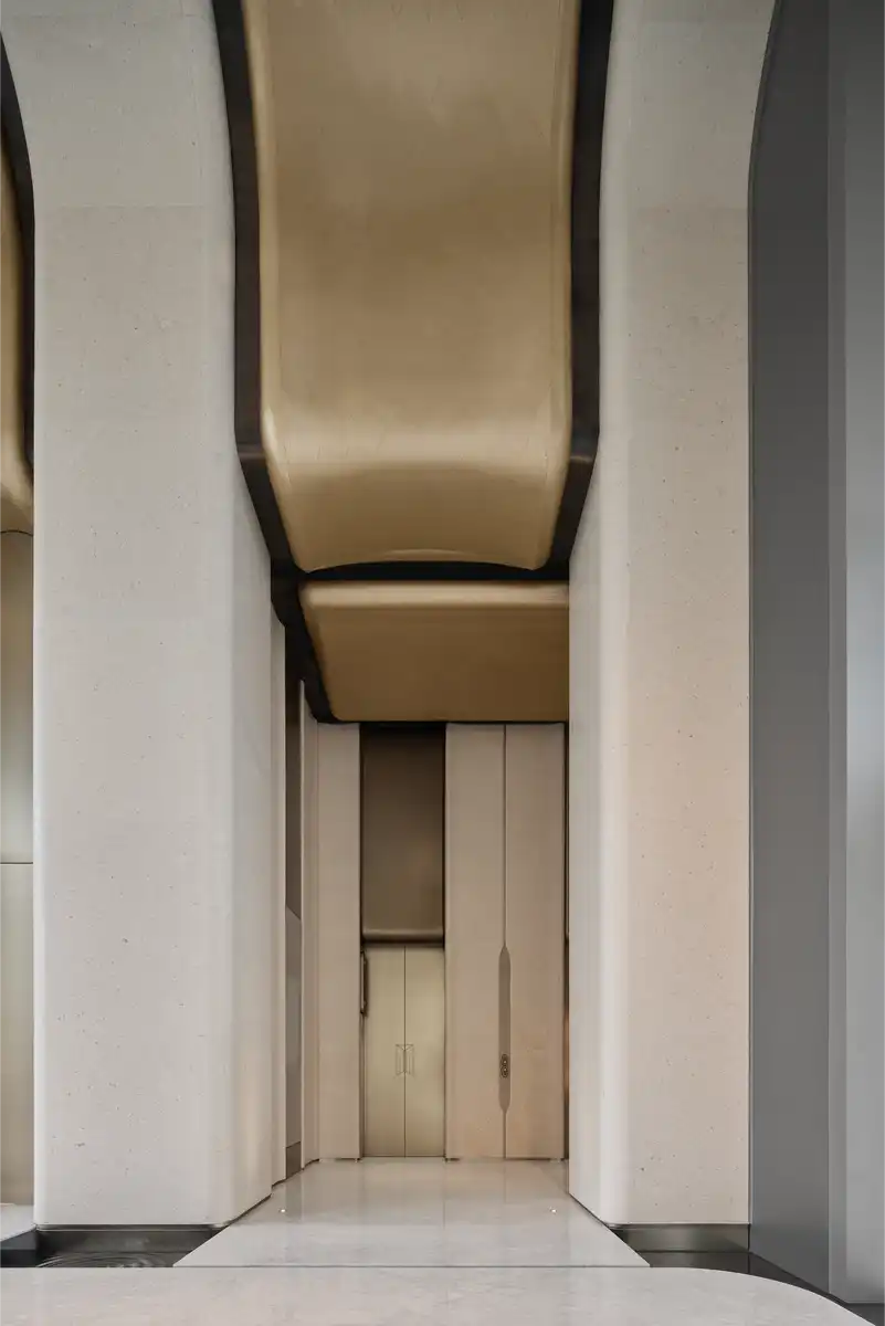 The elevator hall evokes a sense of spatial depth through continuous arches. Sweeping metal curves, complemented by touches of greenery and standalone seating installations, imbue the space with natural rhythms and a futuristic aesthetic.