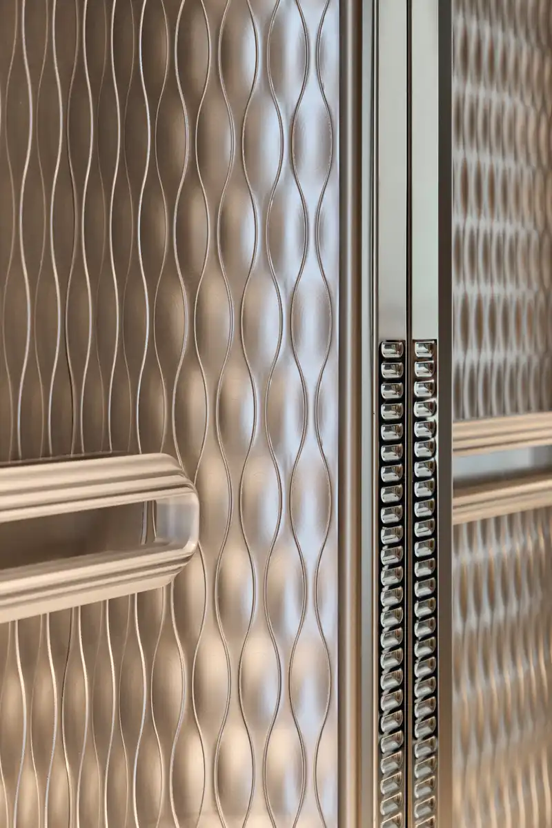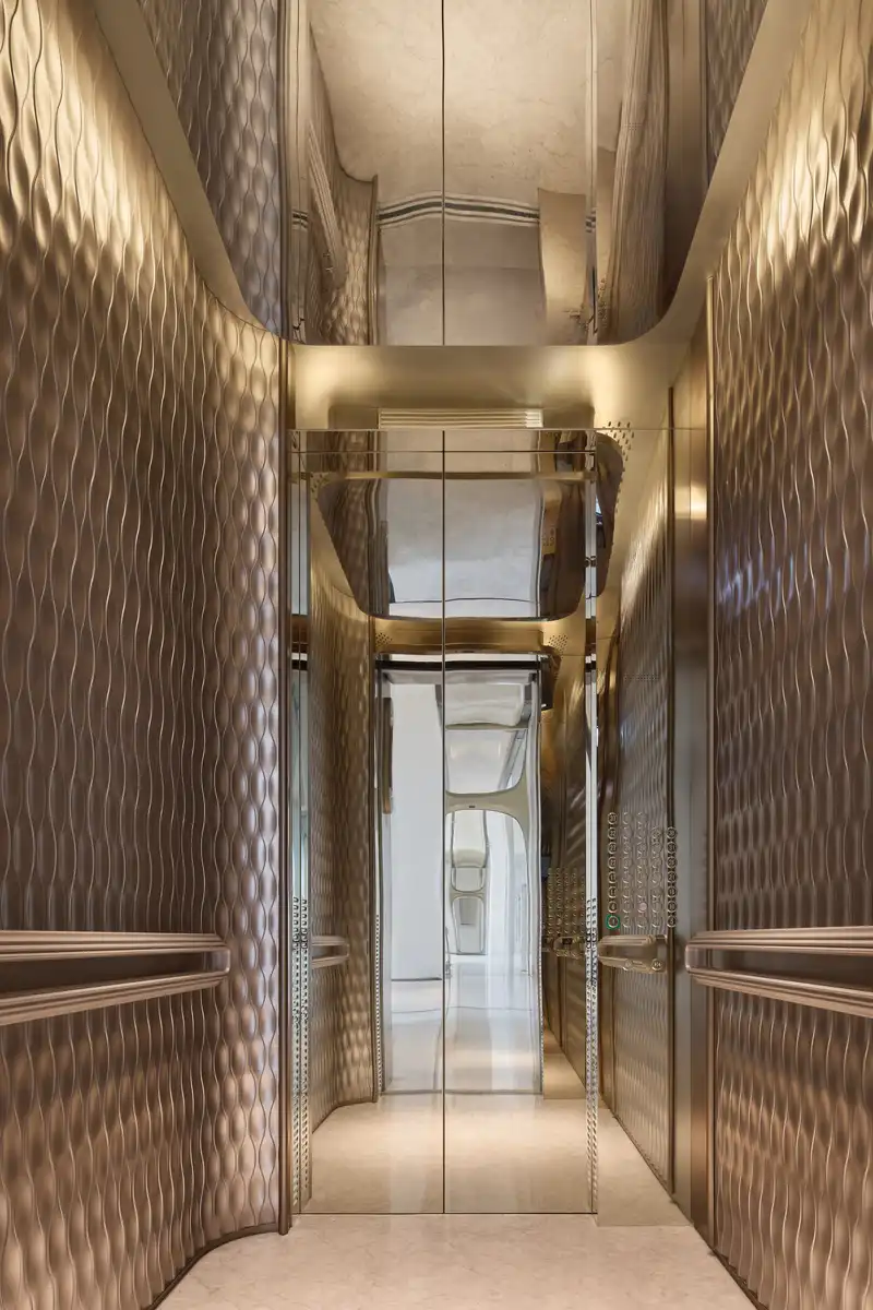 In the elevator hall, a full-height metal backdrop wall sculpted through CNC techniques reveals intricate textures with rhythmic clarity. The combination of mirrored and metal finishes evokes refined modernity, while the meticulous detailing lends the space a sense of openness and layered visual depth.
