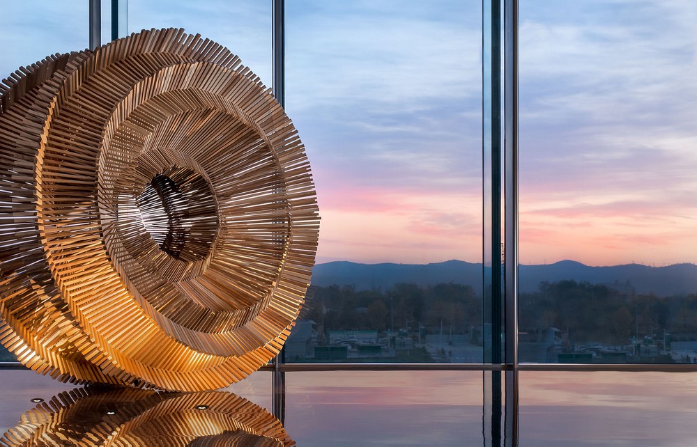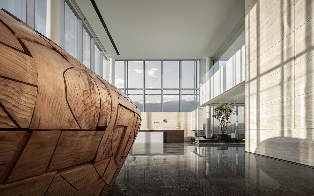 A large irregular spherical art installation is placed at the corner of the foyer, which is eye-catching. With an asymmetrical shape, it offers varying visual experiences to people at different distances, showcasing tension of the space.