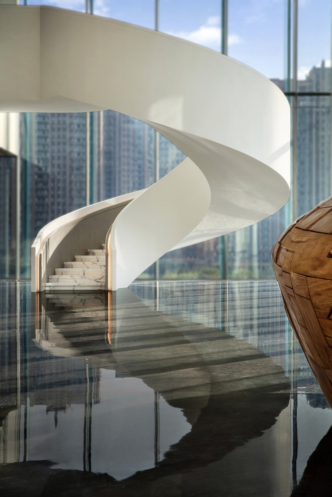 The interior space continues lightness of the building that resembles a “floating crystal palace” and at the same time presents contemporary magnificence via the spatial pattern, functions and experiences. Its partial structures and textures embody architectural concepts in a broad sense.