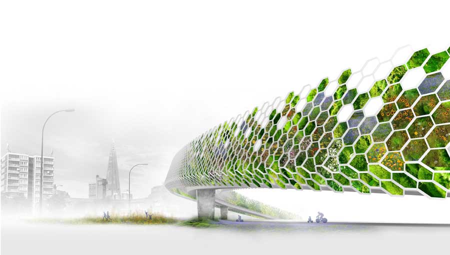 A scheme to transform London’s flyovers into productive and beautiful green arteries to reduce the heat effect and traffic noise and encourage biodiversity.