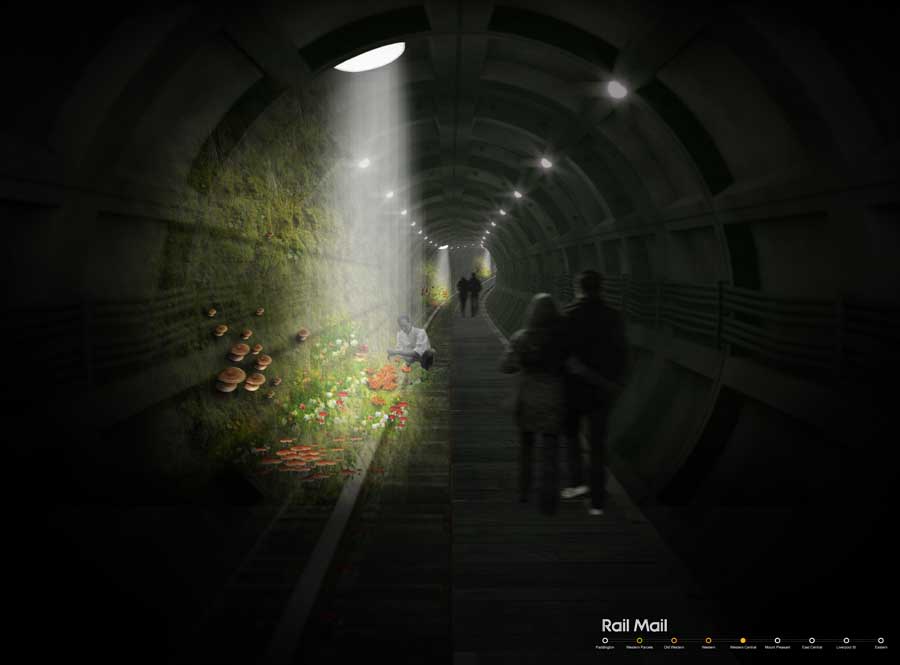 Create an urban mushroom garden lit by sculptural glass-fibre mushrooms at street level inside the ‘Mail Rail’ tunnels beneath Oxford Street.