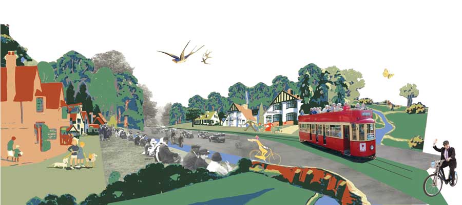 Transform London’s arterial routes into new green spaces linking the Green Belt to the city. Road verges and pavements become multi-functional landscapes for pedestrians and cyclists.